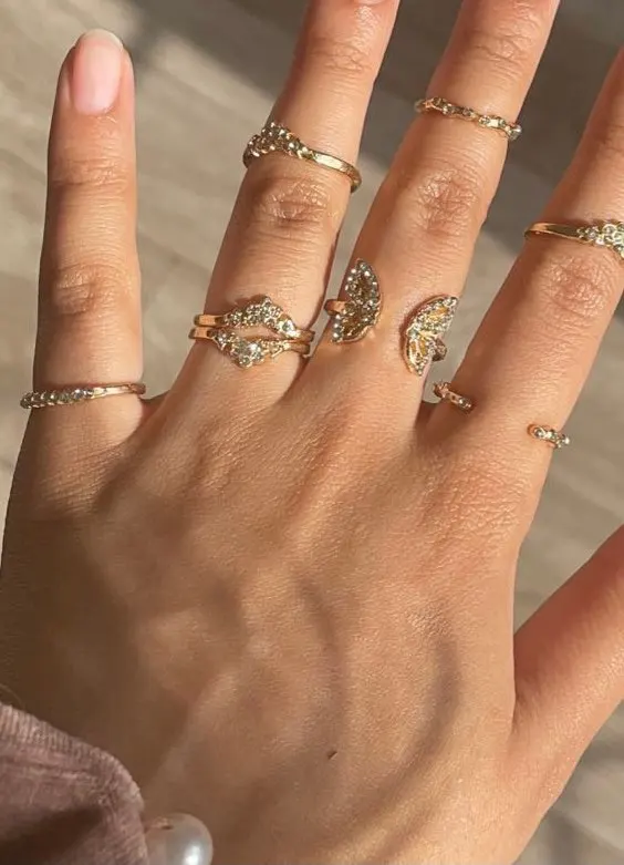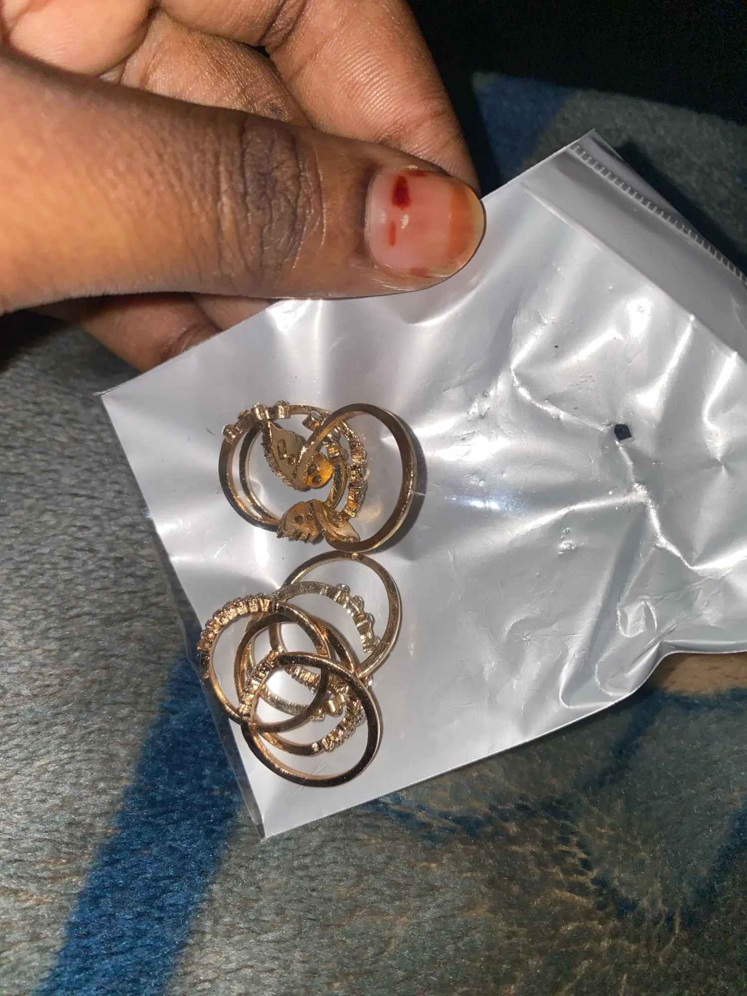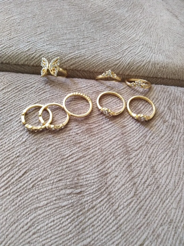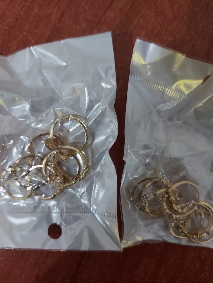 Посылка относительно быстро пришла. Качество не очень хорошое. Одно с колец сразу же сломалось на пополам. Метал не прочные. Золотистый окрас выглядит дешево(