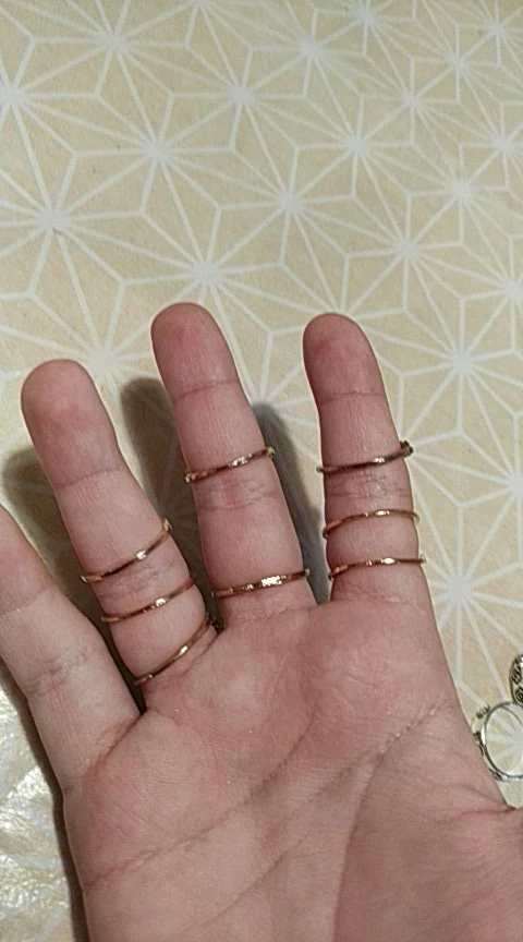 кольца качественные за свою цену, цвет не как на фото, он сильно желтит. на мои толстые пальчики сели хорошо. если хотите заказать, думаю дороже и красивее будут смотреться серебряные. приехали 8 колец, два кольца отдала подруге.