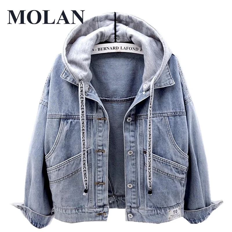 Женская джинсовая куртка MOLAN с капюшоном и большими карманами, однобортная винтажная зимняя верхняя одежда