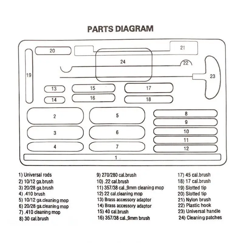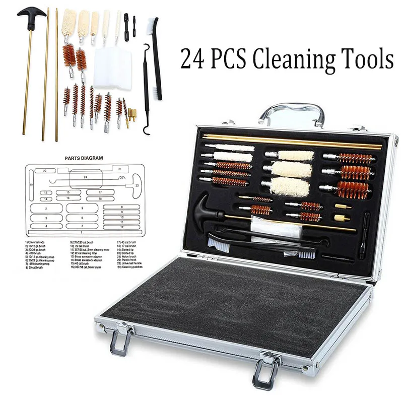 DESC. : Набор для чистки пистолетаСодержание:1 шт. поворотная ручка3 шт./компл. алюминиевые стержни для пистолета ** ручка может поворачиваться самостоятельно. **3 шт./компл. алюминиевые стержни для винтовки ** ручка может поворачиваться самостоятельно. **2 шт. нейлоновый держатель PACTH2 шт. Алюминиевый адаптер50 шт нетканые чистящие патчи1 шт. 10/12 GA. Латунная проволочная щетка1 шт. 20/28 GA. Латунная проволочная щетка1 шт. 410 латунная проволочная щетка1 шт. 45 кал. Латунная проволочная щетка1 шт. 40 кал. Латунная проволочная щетка1 шт. 357/38/. 9 мм коэф. Латунная проволочная щетка1 шт. 17 Кал. Латунная проволочная щетка1 шт. 270/280 кал. Проволочная щетка1 шт. 22 кал. Латунная проволочная щетка1 шт. 10/12 GA. Махровая Чистящая Швабра1 шт. 410 махровая Чистящая Швабра1 шт. 357/38/. 9 мм махровые очистная Швабра1 шт. 22 кал. Махровая Чистящая Швабра1 шт. алюминиевая упаковочная коробка