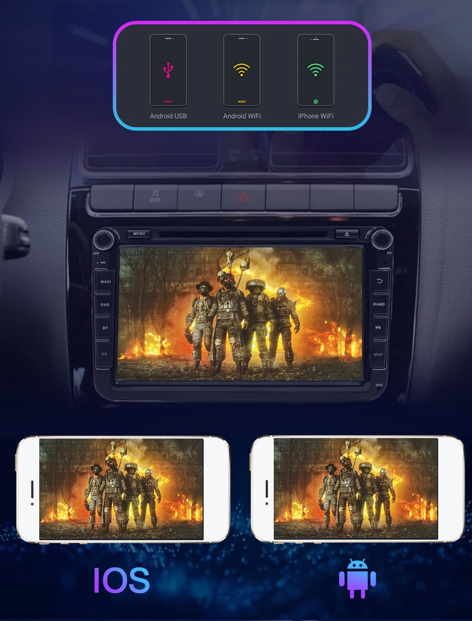 Поддержка зеркального соединения для устройств Android и IOS через usb-кабель или Wi-Fi. Это может обеспечить взаимный контроль между этим устройством и вашим телефоном