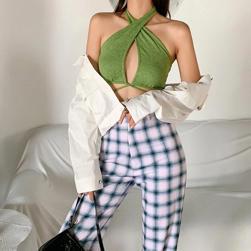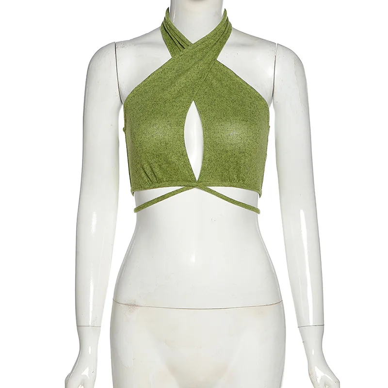 Женский укороченный топ без рукавов, с открытой спиной, зеленого цвета, с запахом, для клувечерние, уличная одежда, укороченные топы на бретельках