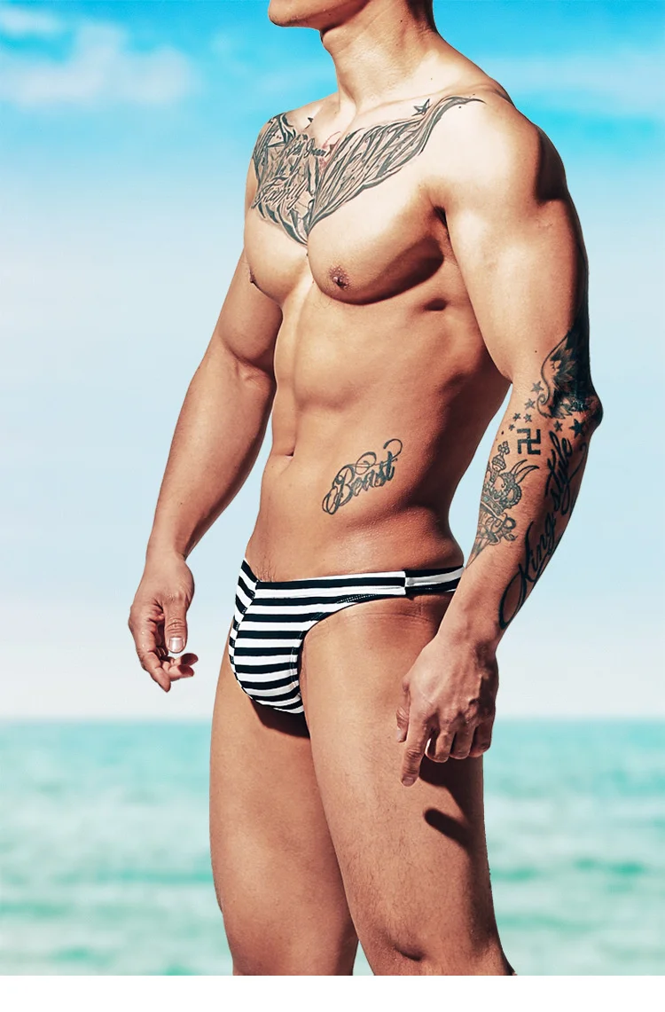 Пляжные плавки, мужские полосатые сексуальные плавки, горячий купал...