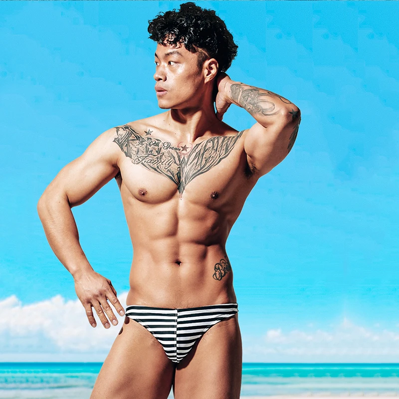 Пляжные плавки, мужские полосатые сексуальные плавки, горячий купал...