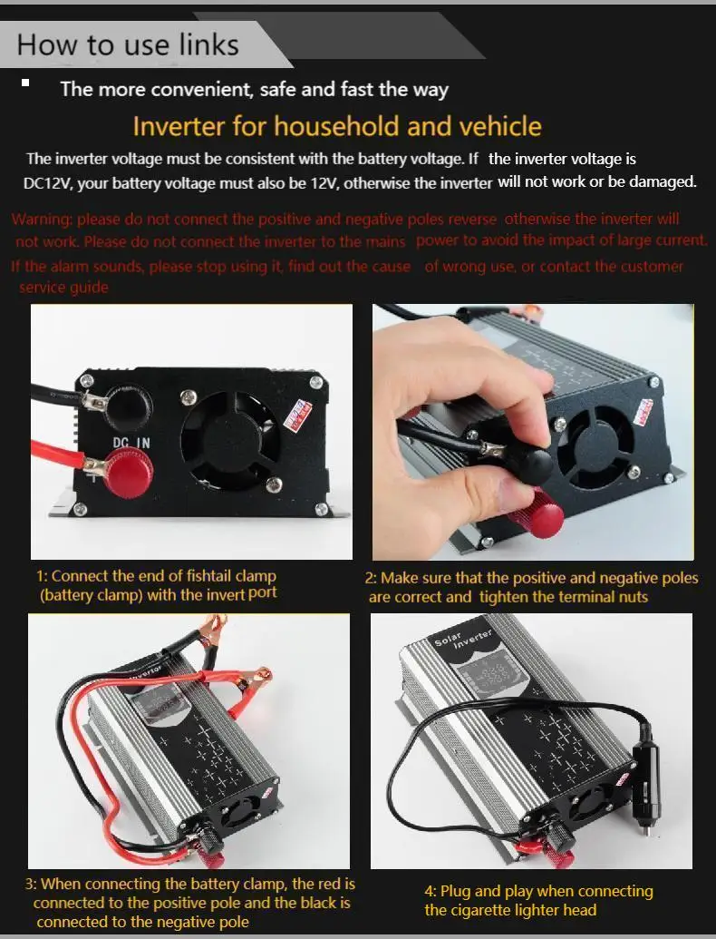 "Посылка включает в себя:1 x инвертор питания2 x батарейный зажим1 х разъем прикуривателя (подарок)1 х руководство на английском языкеХарактеристики:Модель: SP4000 (черный и желтый на ваш выбор)Название: автомобильный инвертор 4000 Вт.Вход напряжение: DC 10,5 V ~ 15В,(В тех случаях, когда напряжение батареи ниже, чем 10,5 V инвертор-это защита от низкого напряжения, когда напряжение батареи если сумма вашего заказа превышает 15V, инвертор высокого напряжения Защита)Выходное напряжение: 110 В переменного тока/220 В на ваш выборВыходная частота: 50 Гц для модели 220 В/60 Гц для модели 110 В.Пиковая мощность: 4000 ВтНоминальная мощность: 300 Вт