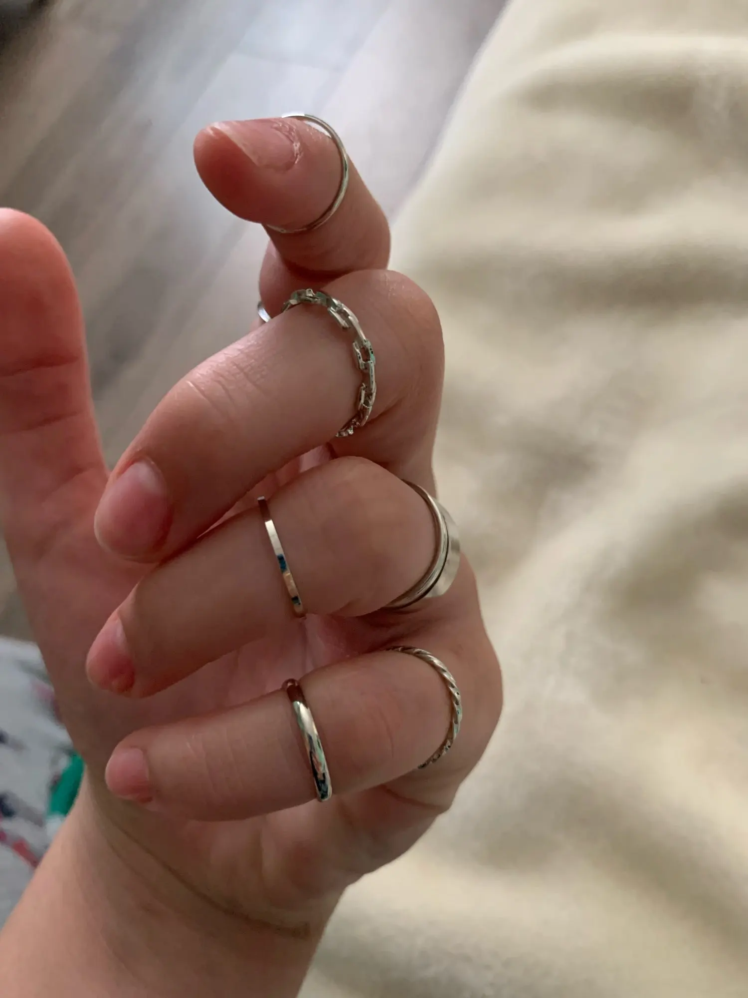немного, совсем чуть чуть отличается от золота, чуть ярче блестит, а так очень понравились. всё колечки на разные фаланги как на фото, рекомендую