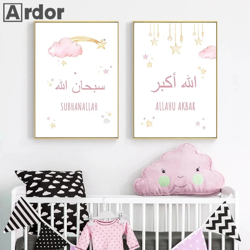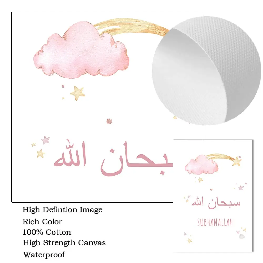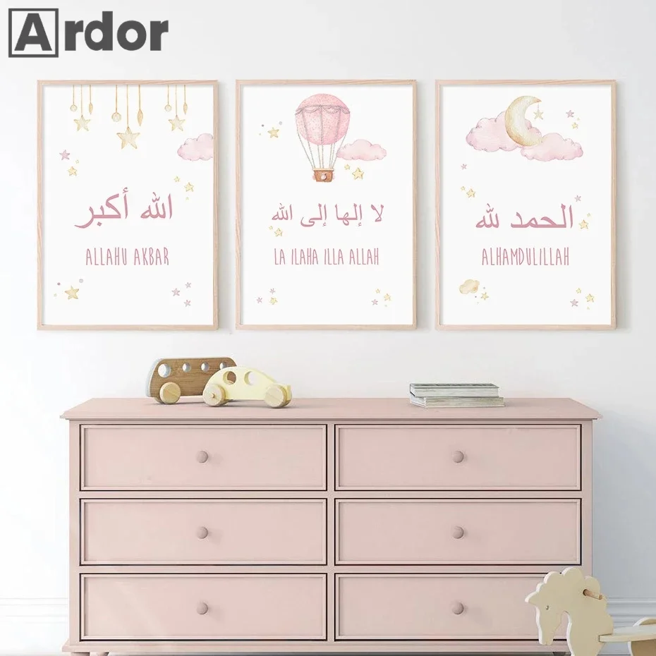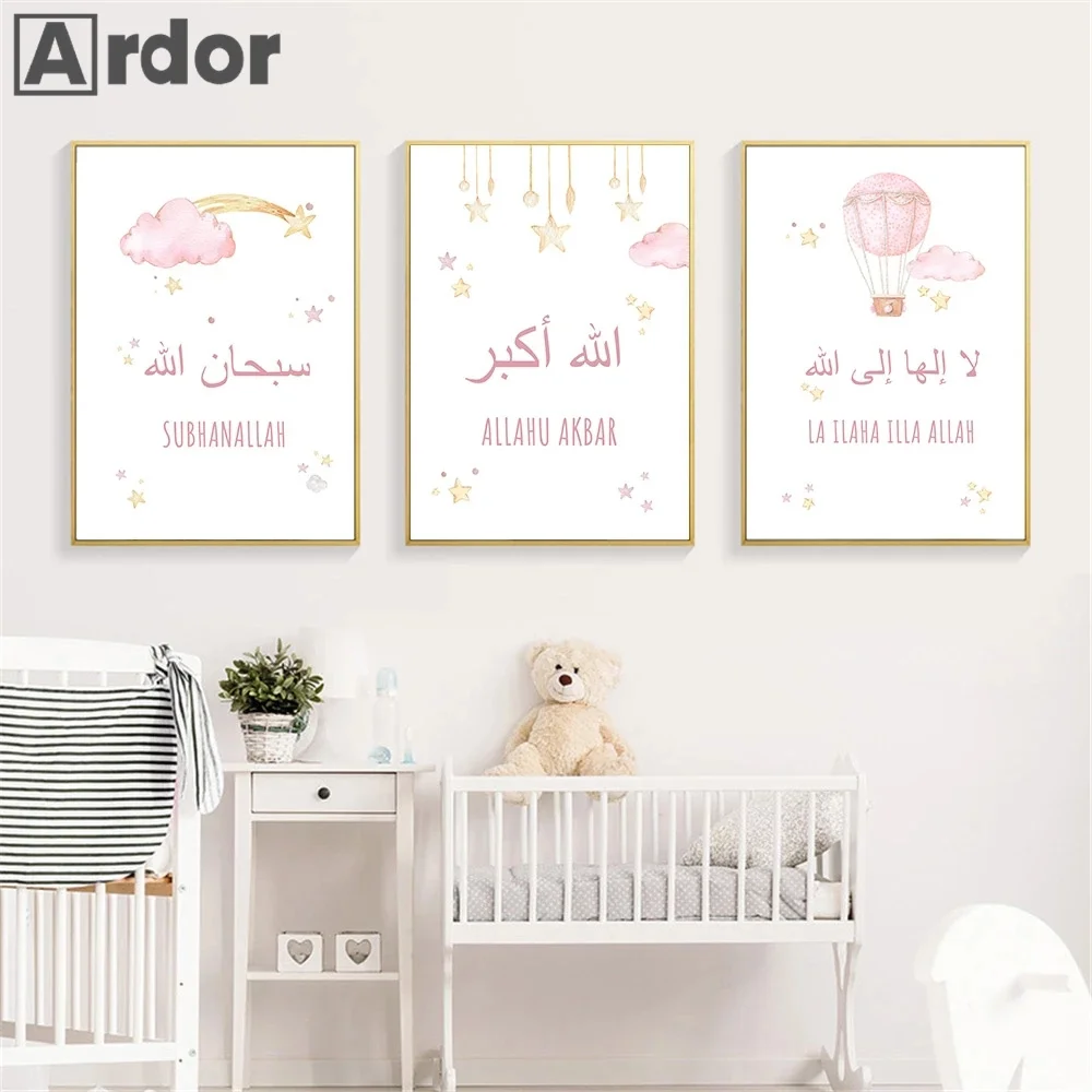 Плакат с исламической каллиграфией, розовая луна, звезды, облако, воздушный шар, настенные художественные принты, Картина на холсте для детской, скандинавский Декор для комнаты для девочек
