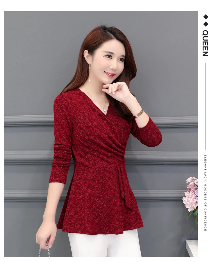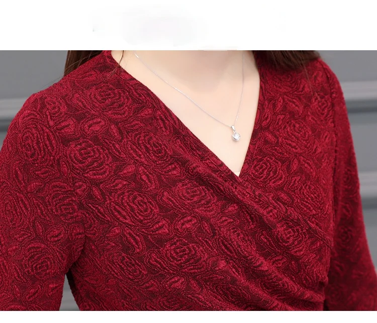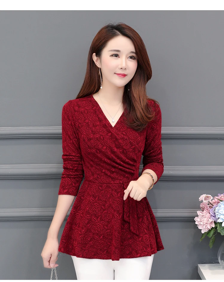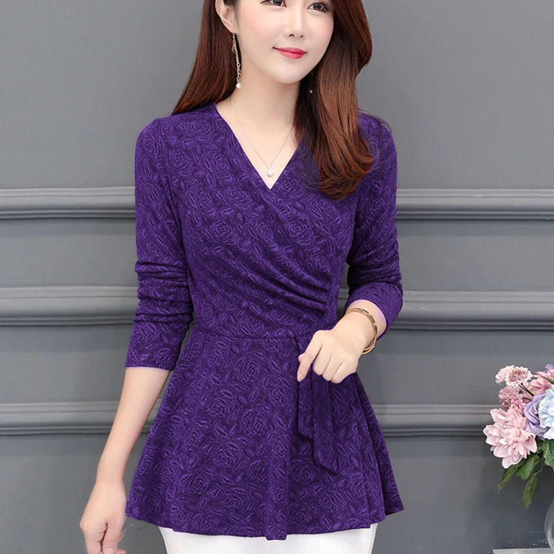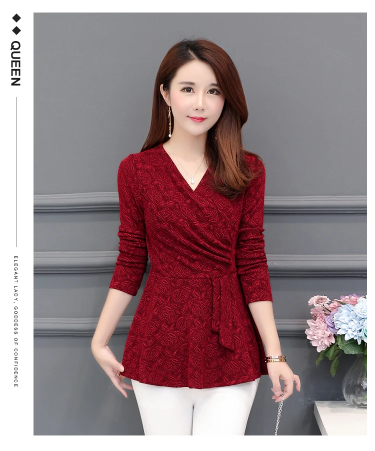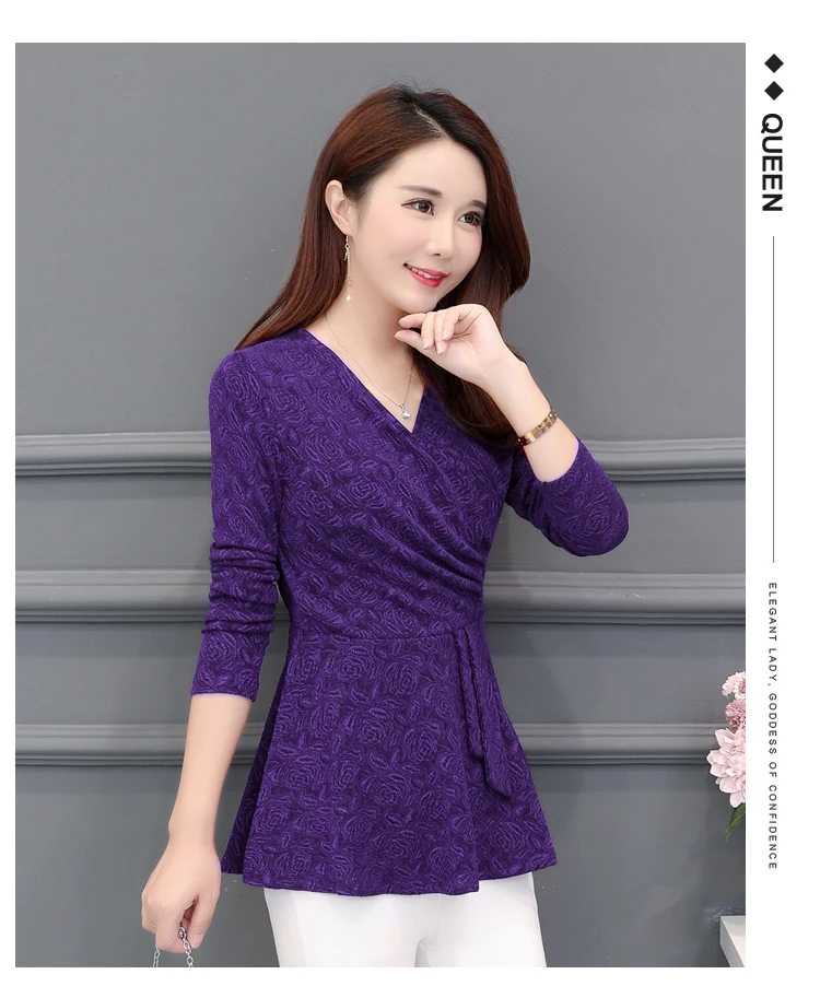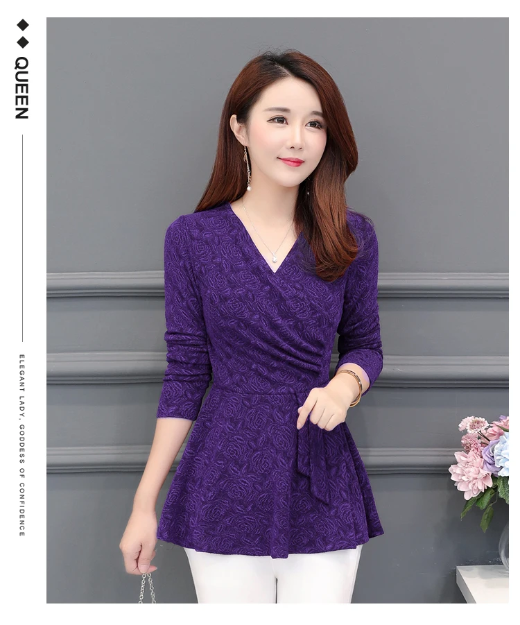 Женский топ с V-образным вырезом, облегающий Топ с длинным рукавом, фиолетовые красные цветы, блузки, рубашки повседневные, новинка 2021, размера плюс