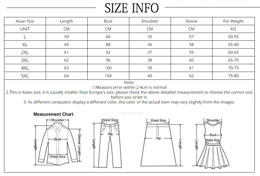 2. Это Азиатский Размер, он обычно меньше европейского размера, пожалуйста, проверьте приведенные выше подробные измерения, чтобы выбрать правильный размер перед заказом.