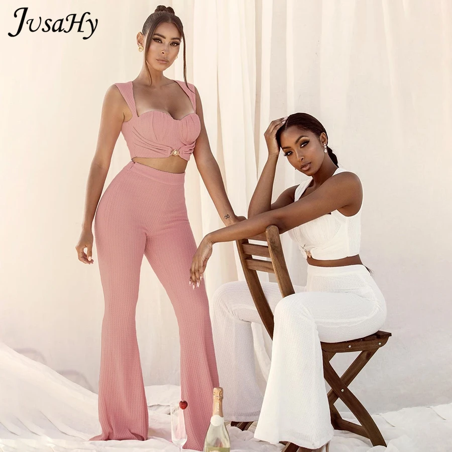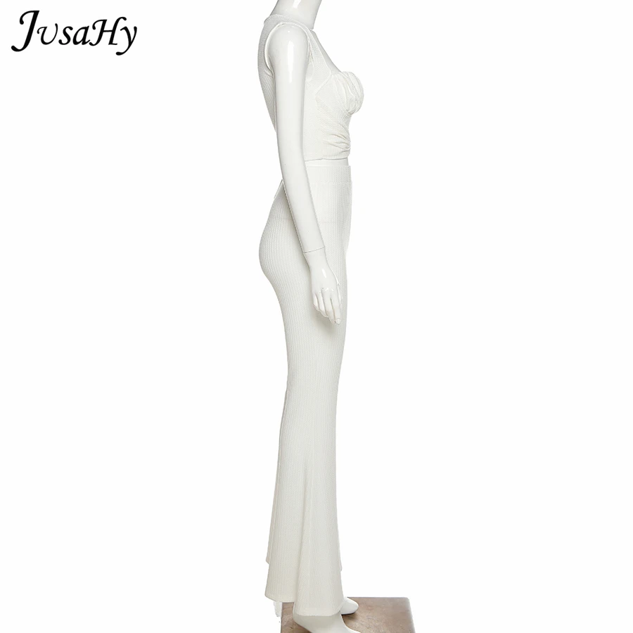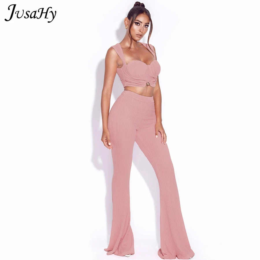 JusaHy однотонный вязаный элегантный офисный Женский комплект из двух предметов женская кофта и расклешенные брюки свободный эластичный повседневный уличный наряд