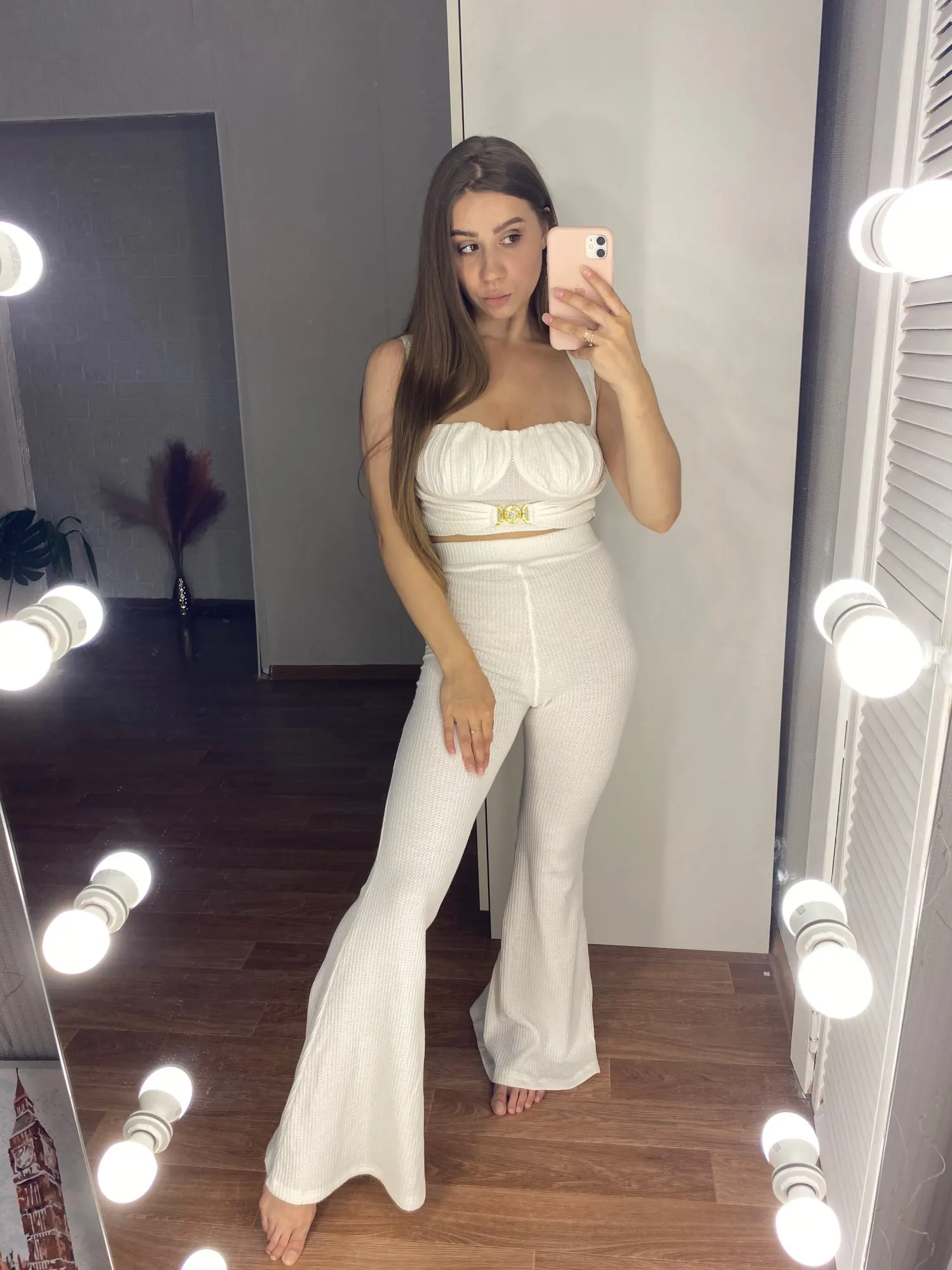 Брендовая белая Бриллиантовая кофта и Облегающие расклешенные брюки...