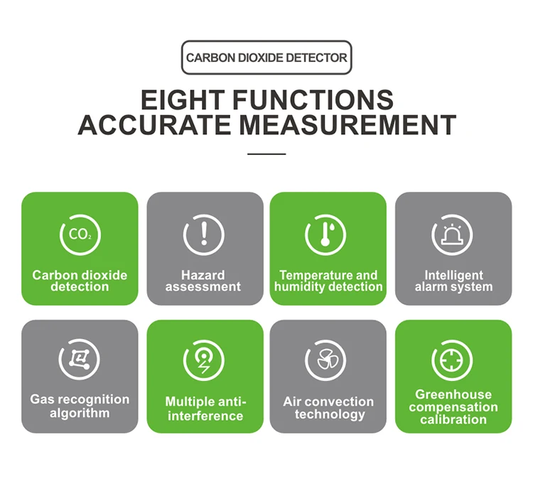 Функции: обнаружение углекислого газа, оценка опасности, обнаружение температуры и влажности, интеллектуальная система сигнализации, алгоритм распознавания газа, множественные анти-помехи, технология конвекции воздуха, калибровка компенсации теплицы.