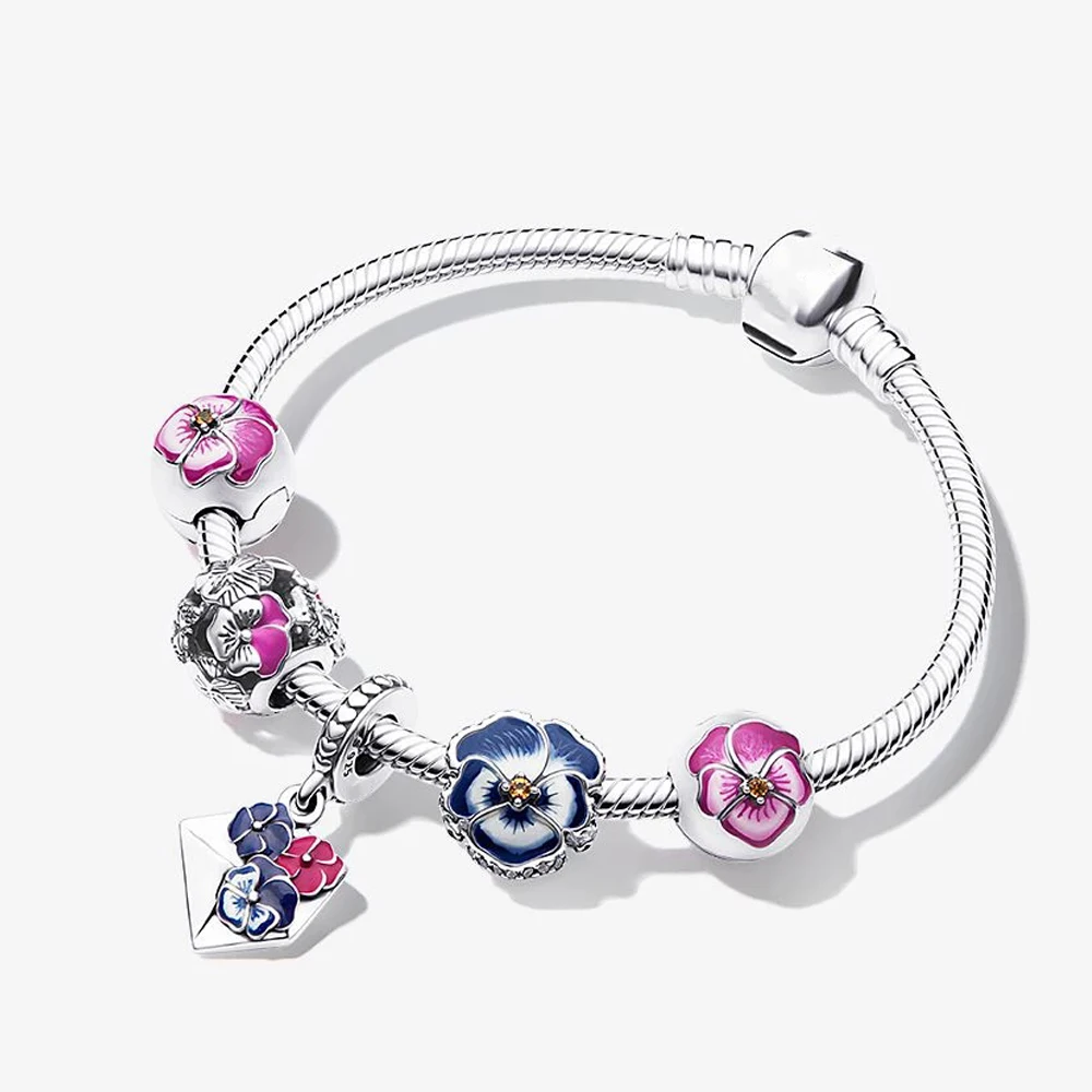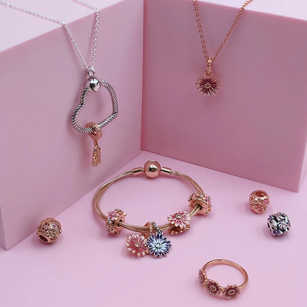 Женский браслет из серебра 2022 пробы с розовыми маргаритками