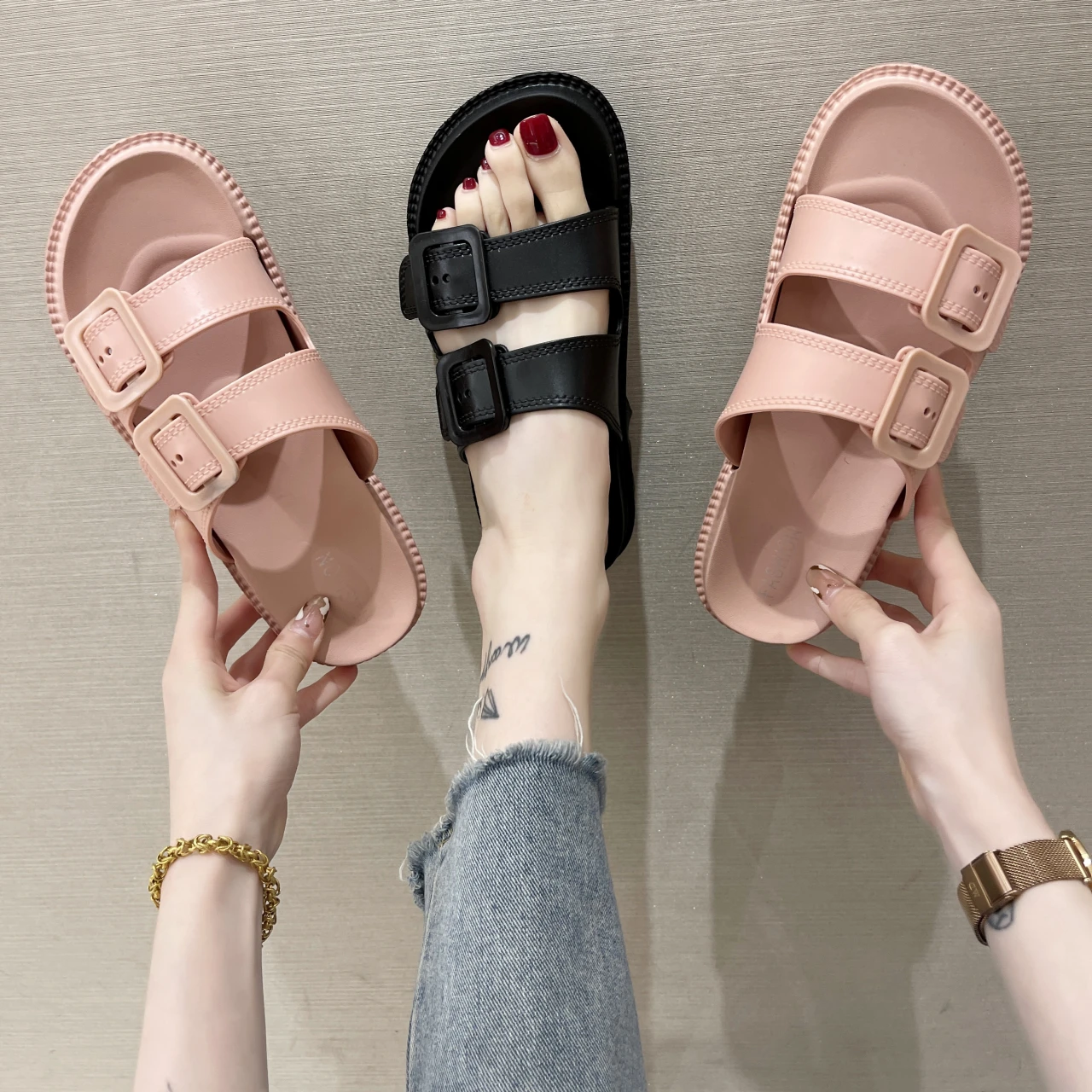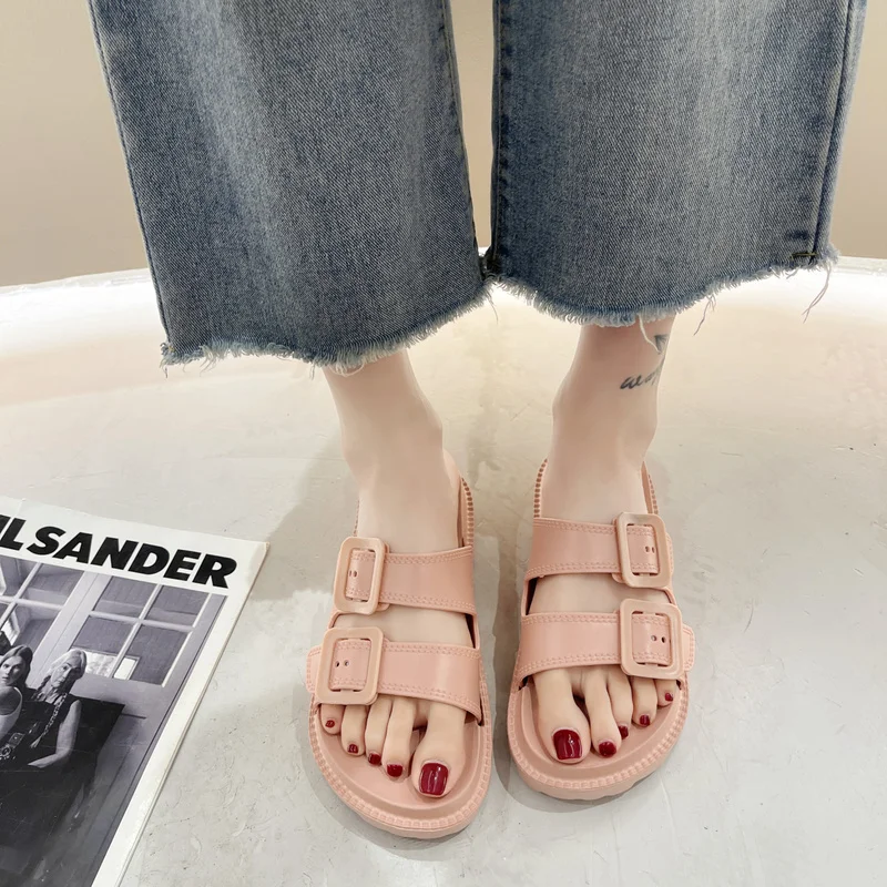 Женские шлепанцы на плоской подошве, Женская универсальная обувь на платформе, женские модные пляжные шлепанцы из искусственной кожи, украшение с пряжкой
