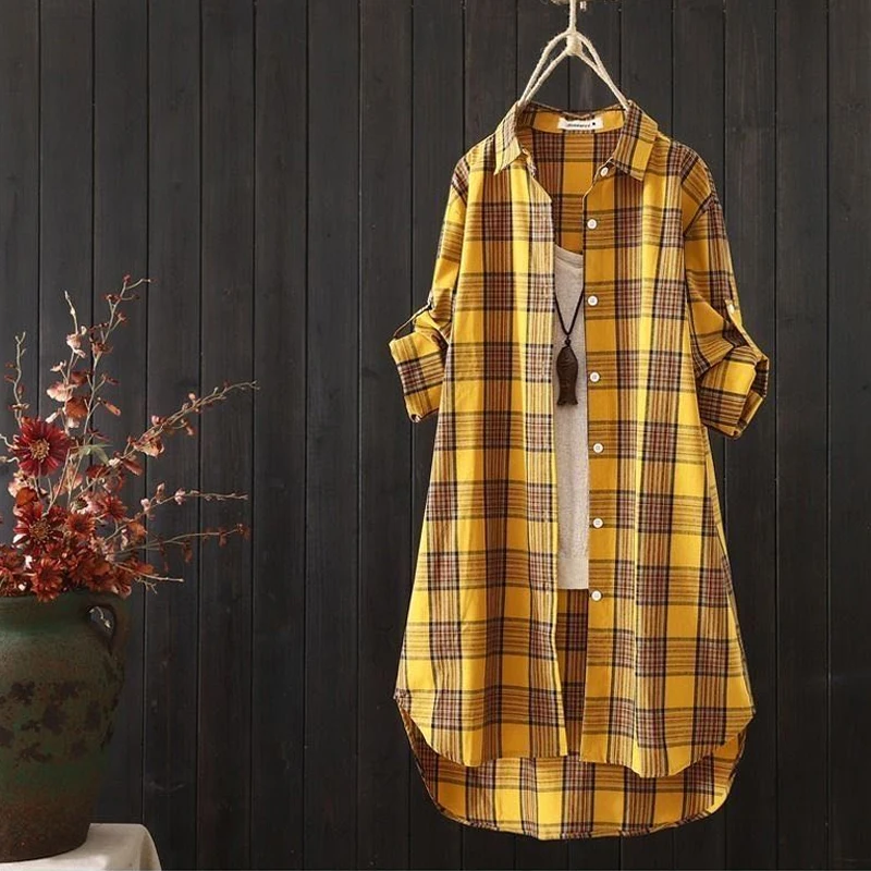 Женская одежда 2021 Летняя женская блузка клетчатая женская блузка Рубашки с длинным рукавом женская блузка из хлопка и льна KN221