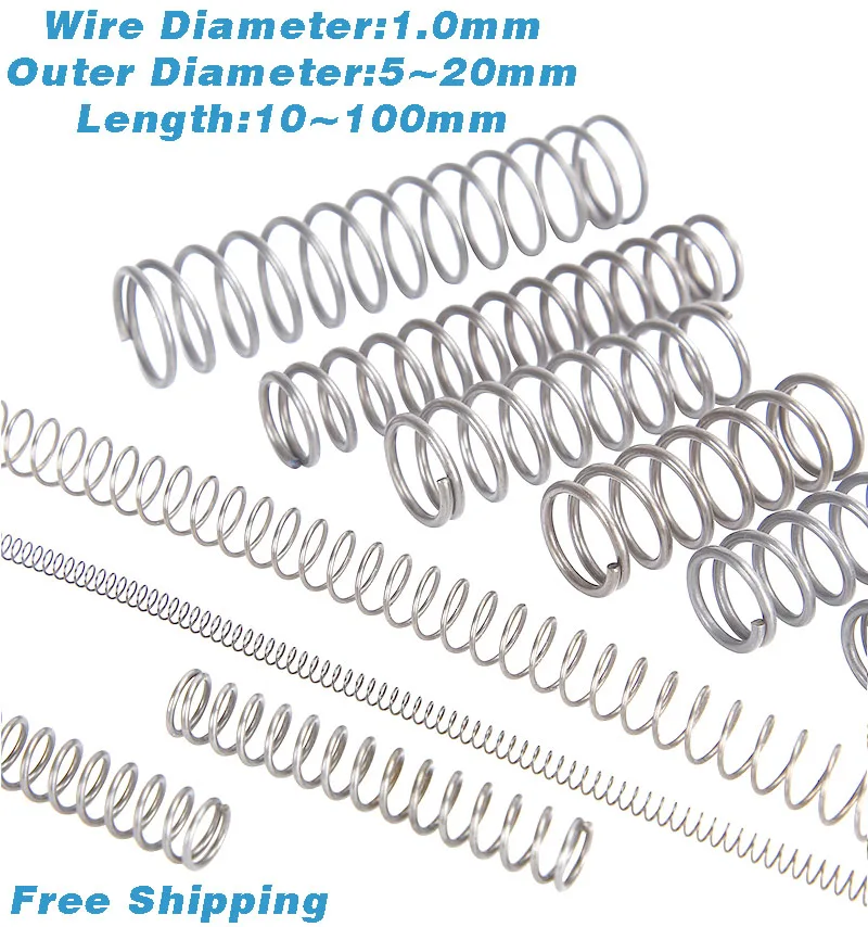 Описание размера: диаметр провода * наружный диаметр * длина1. Название продукта: Пружина сжатия2. Материал изделия: пружинная сталь3. Внутренний диаметр изделия: 1,0 мм4. Внешний диаметр изделия: 5 6 7 8 9 10 11 12 13 14 15 16 17 18 19 20 мм5. Весна длина = 10/15/20/25/30/35/40/45/50/60/70/80/90/100 мм