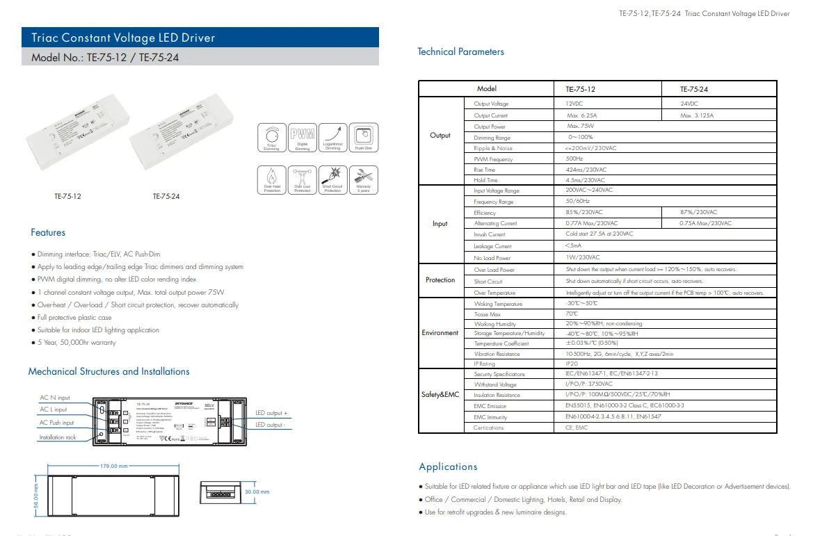 Светодиодный драйвер Triac с регулируемой яркостью, постоянное напряжение 1CH 40 Вт 75 Вт, переменный ток 220 В, постоянный ток 12 В, 24 В, ШИМ, цифровой Диммируемый светодиодный драйвер Triac для ленты