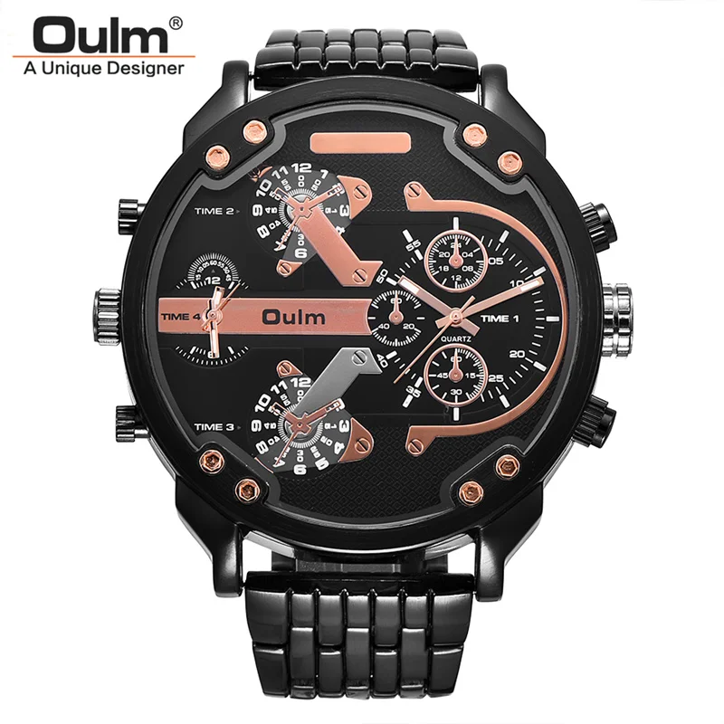 Часы наручные Oulm с очень большим циферблатом, мужские роскошные Брендовые Часы с двумя часовыми поясами, военные часы, мужские кварцевые часы, мужские часы