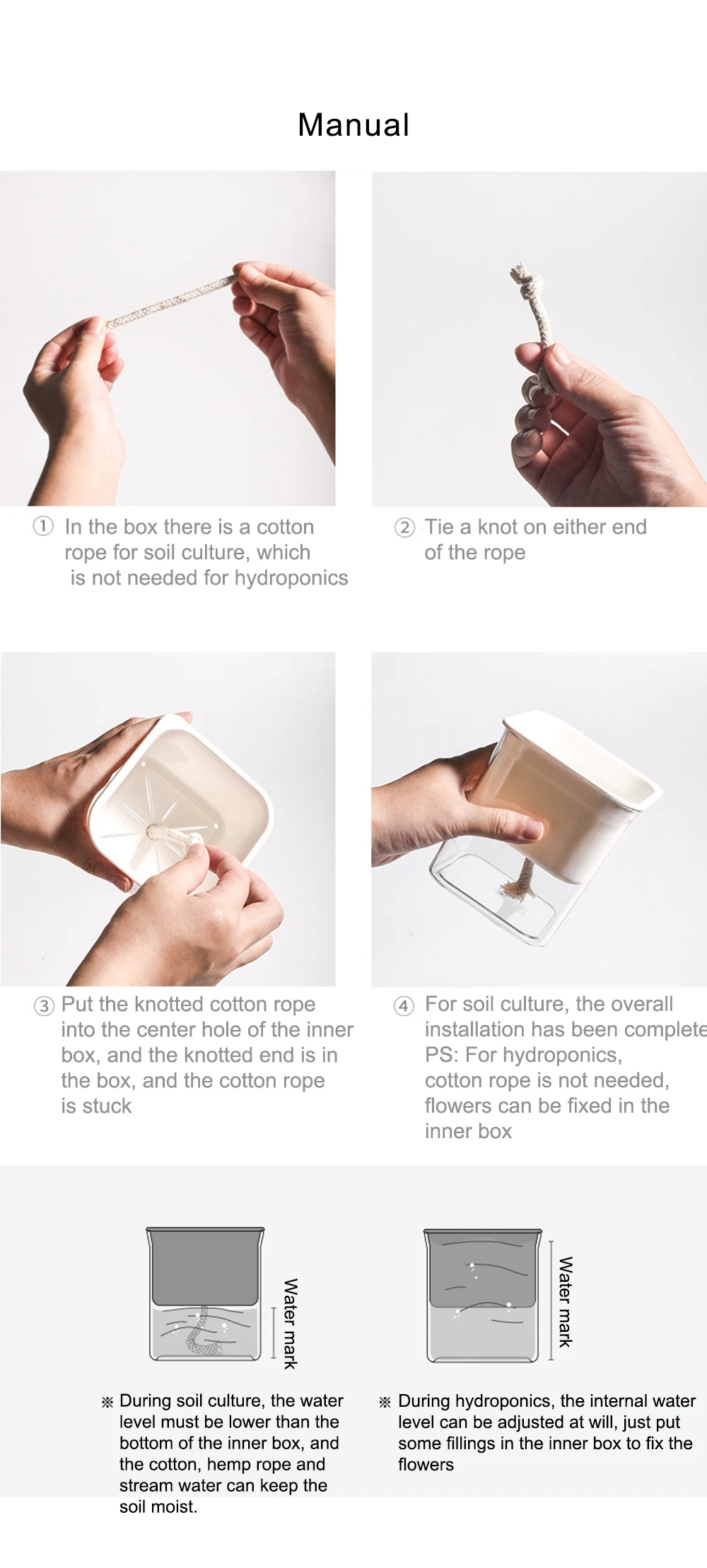 1. В коробке есть хлопчатобумажная веревка для почвенной культуры, которая не нужна для гидропоники2. Завяжите узел на любом конце веревки3. Поместите завязанный Хлопковый Канат в отверстие для certer внутренней коробки, а завязанный конец находится в коробке, а Хлопковый Канат застревает.4. Для культуры почвы, общая установка была завершена. PS: для гидропоники цветы могут быть закреплены во внутренней коробке.* Во время почвенной культуры уровень воды должен быть ниже, чем bottim внутренней коробки, а хлопок, пеньковая веревка и поток воды могут держать почву влажной.* Во время гидропоники внутренний уровень воды может быть скорректирован по желанию, просто выньте несколько наполнителей во внутренней коробке, чтобы зафиксировать цветы