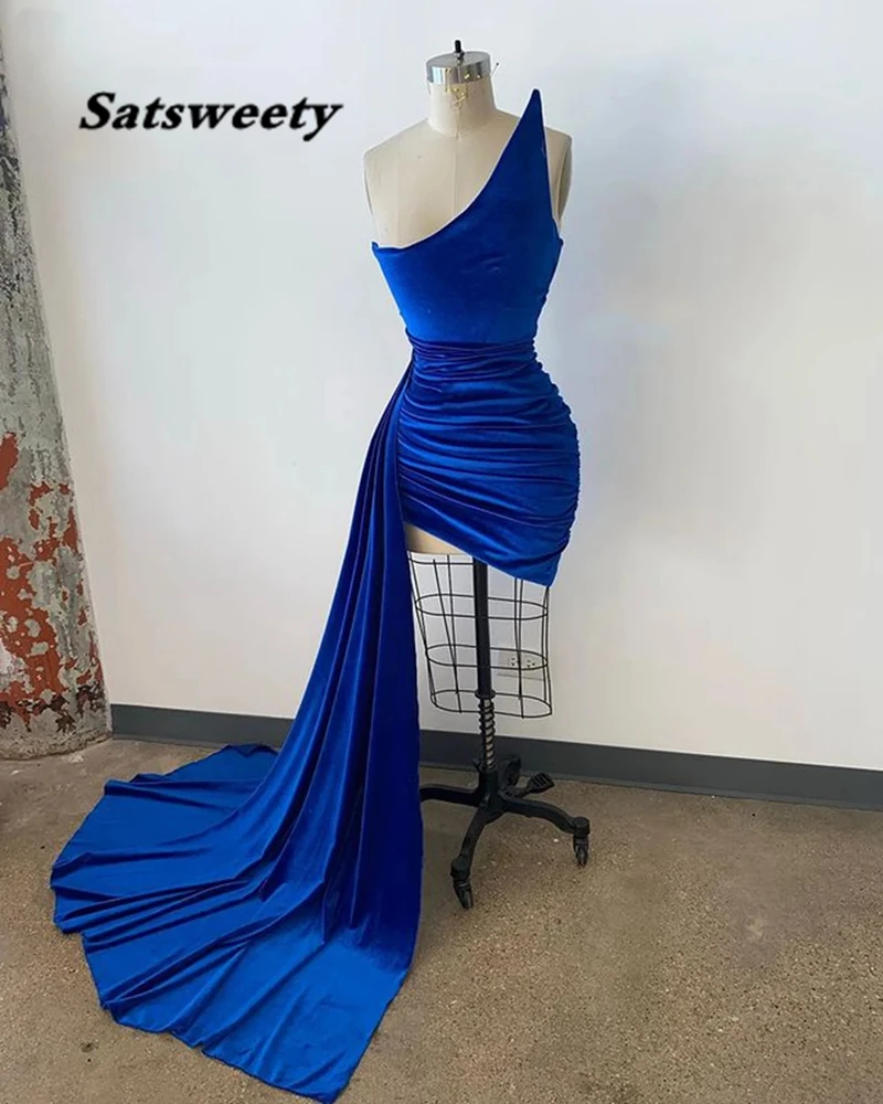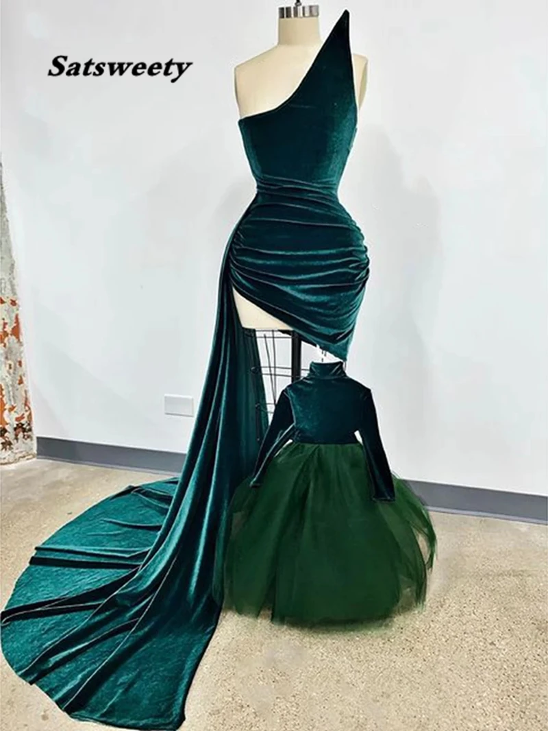 Новый дизайн, ассиметричные короткие бархатные платья для выпускного вечера, изумрудно-зеленого цвета, без бретелек, с боковым шлейфом, 2022