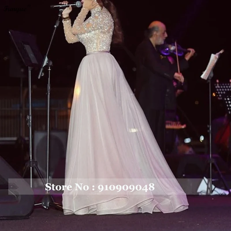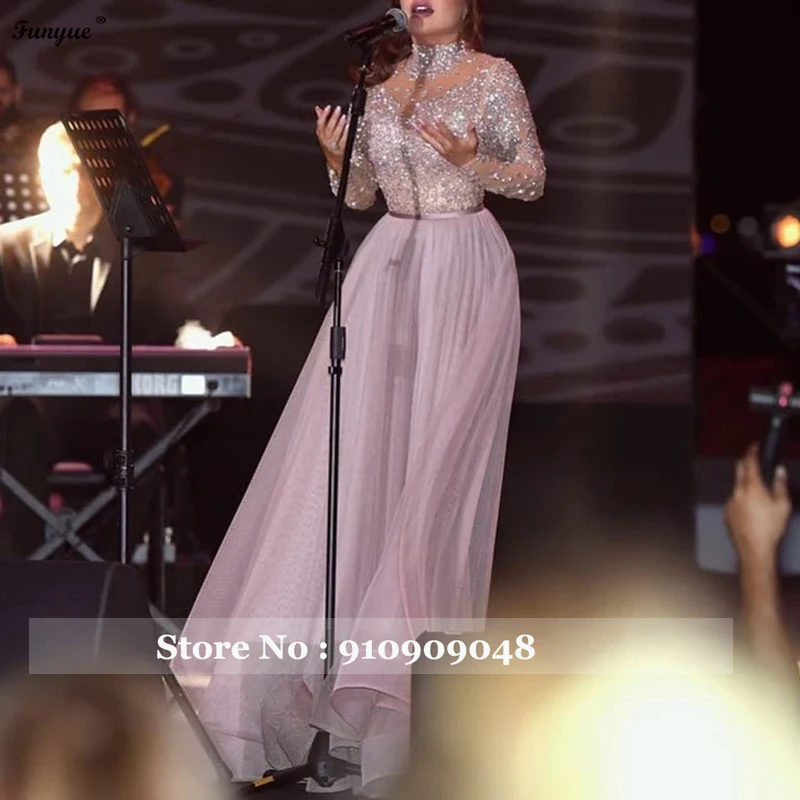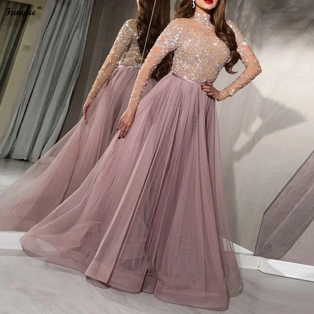 Блестящие вечерние платья с высоким воротником и длинным рукавом, розовое Тюлевое платье-трапеция для выпускного вечера, 2021, бальное платье с аппликацией и бисером для вечеринки
