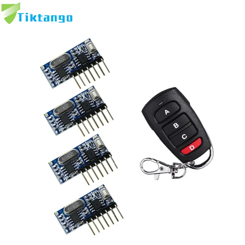 Радиочастотный пульт дистанционного управления Tiktango, передатчик и Беспроводной Приемник 433 МГц, обучающий код 1527, модуль декодирования, 4 канала, кнопка обучения