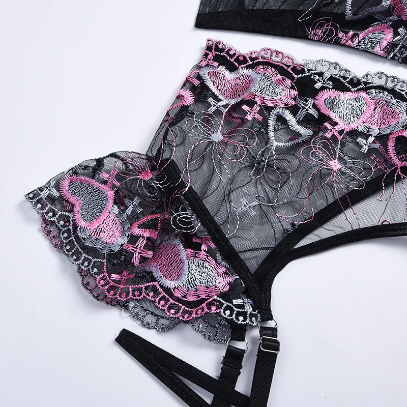 Комплект эротического женского нижнего белья, 3 шт., тонкое прозрачное кружевное нижнее белье с подвязками и белым сердцем