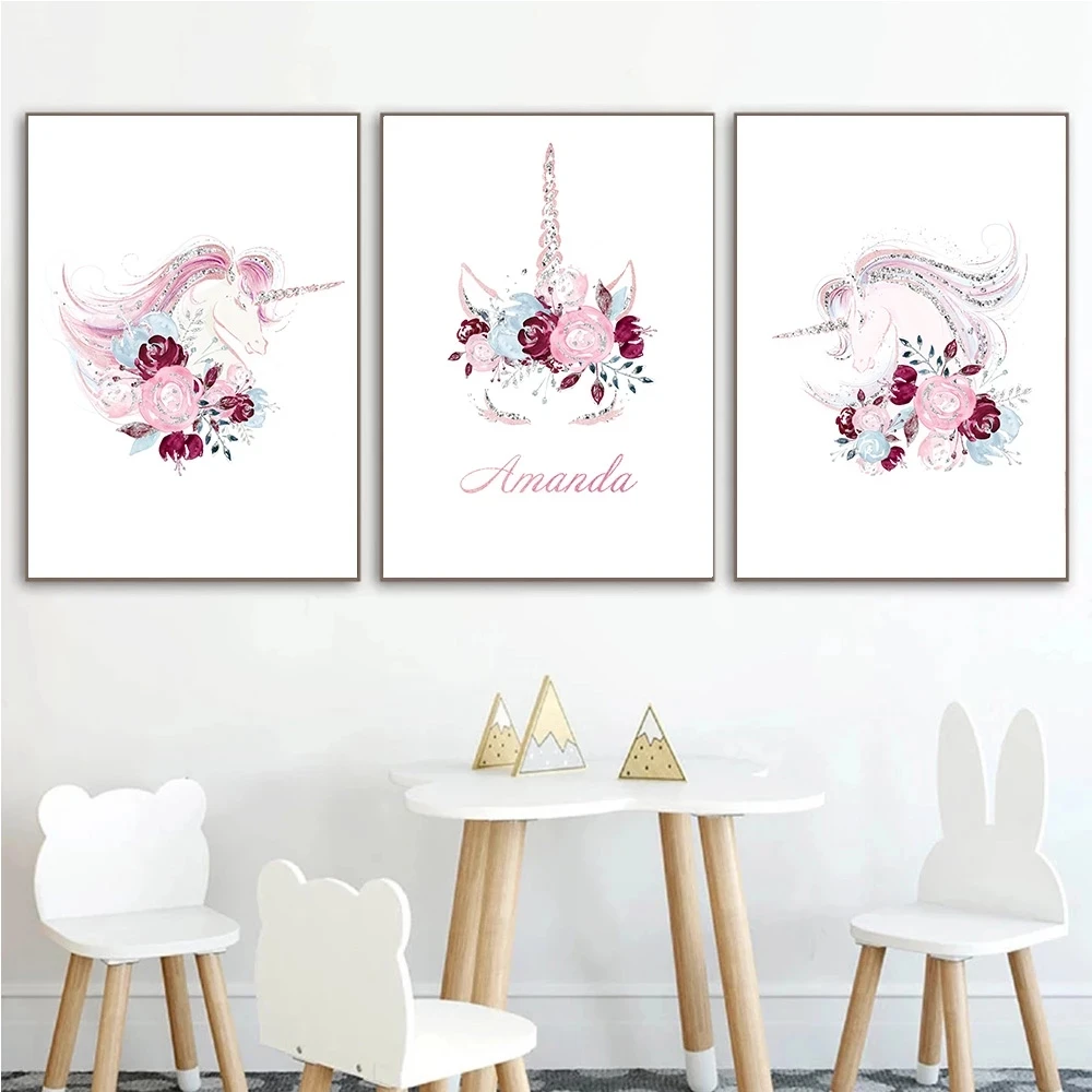 Постеры на заказ с именем девушки, розовые цветы, единорог, холст, картина для детской, настенная печать, скандинавский декор, картина, декор для детской комнаты