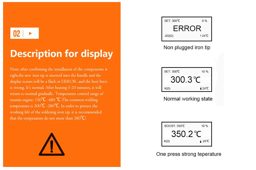 Примечание: железный наконечник не работает непрерывно при высокой температуре, высокотемпературная работа легко повредить наконечник! Обычная температура плавления припоя 183 °C, бессвинцовая температура плавления припоя 227 °C, обычно температура сварки 300-380 °C, 380 °C-это температура разделительной линии, выше 380 °C, окисление и потеря железной головки чрезвычайно быстрые, серьезно влияют на срок службы нагревательного сердечника, дисплей температуры выше 380 °C будет биться, Чем выше температура, тем выше удар! Рекомендуется при температуре 300-380 ° C для сварочных работ, большая часть работ может быть выполнена, температура при ударе является нормальной, не влияет на использование!