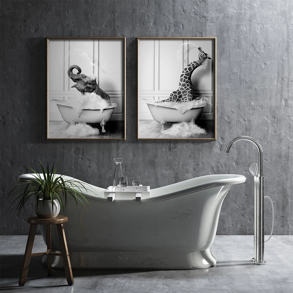 Черно-белые холщовые постеры с животными в ванне и принтом пингвина слона зебры жирафа настенная живопись картины для декора ванной комнаты
