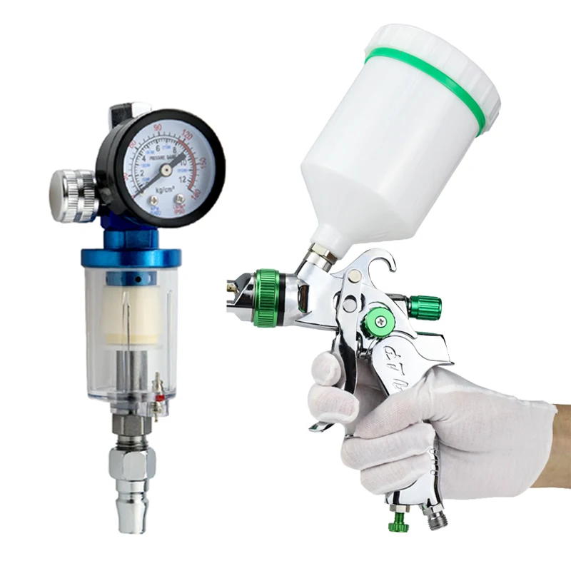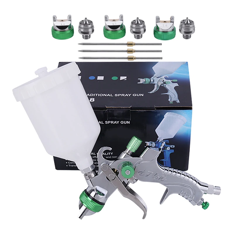 Рекомендуется для идеального распыления базового покрытия, прокладок и других высоковязких покрытийПодходит для бытового и промышленного грунтовки, верхнего покрытия и детализации для автомобильной промышленности, оборудования и мебельной краскиХарактеристики продукции:Материал распылителя: алюминиевый сплавМатериал чашки: ПВХ пластикТип: высокий объем низкого давленияСопло жидкости: 1,4 мм, 1,7 мм, 2,0 ммРасход воздуха: 14.5CFMОперационной Давление: 2-3,5 барШирина узора: 160-240 ммРазмер бункера: диаметр 10 смВоздухозаборник: 1/4 дюймаЕмкость чашки: 600cc