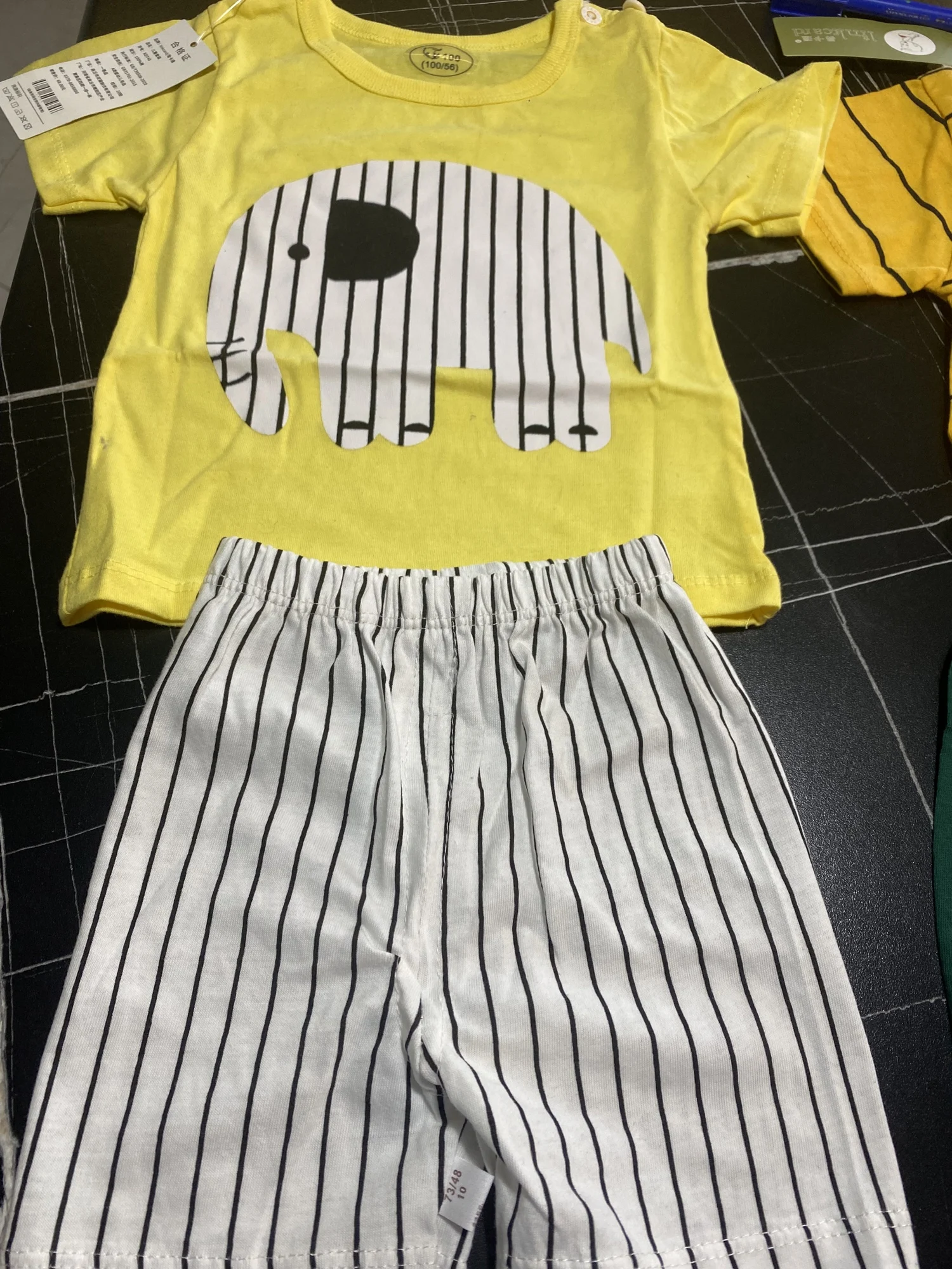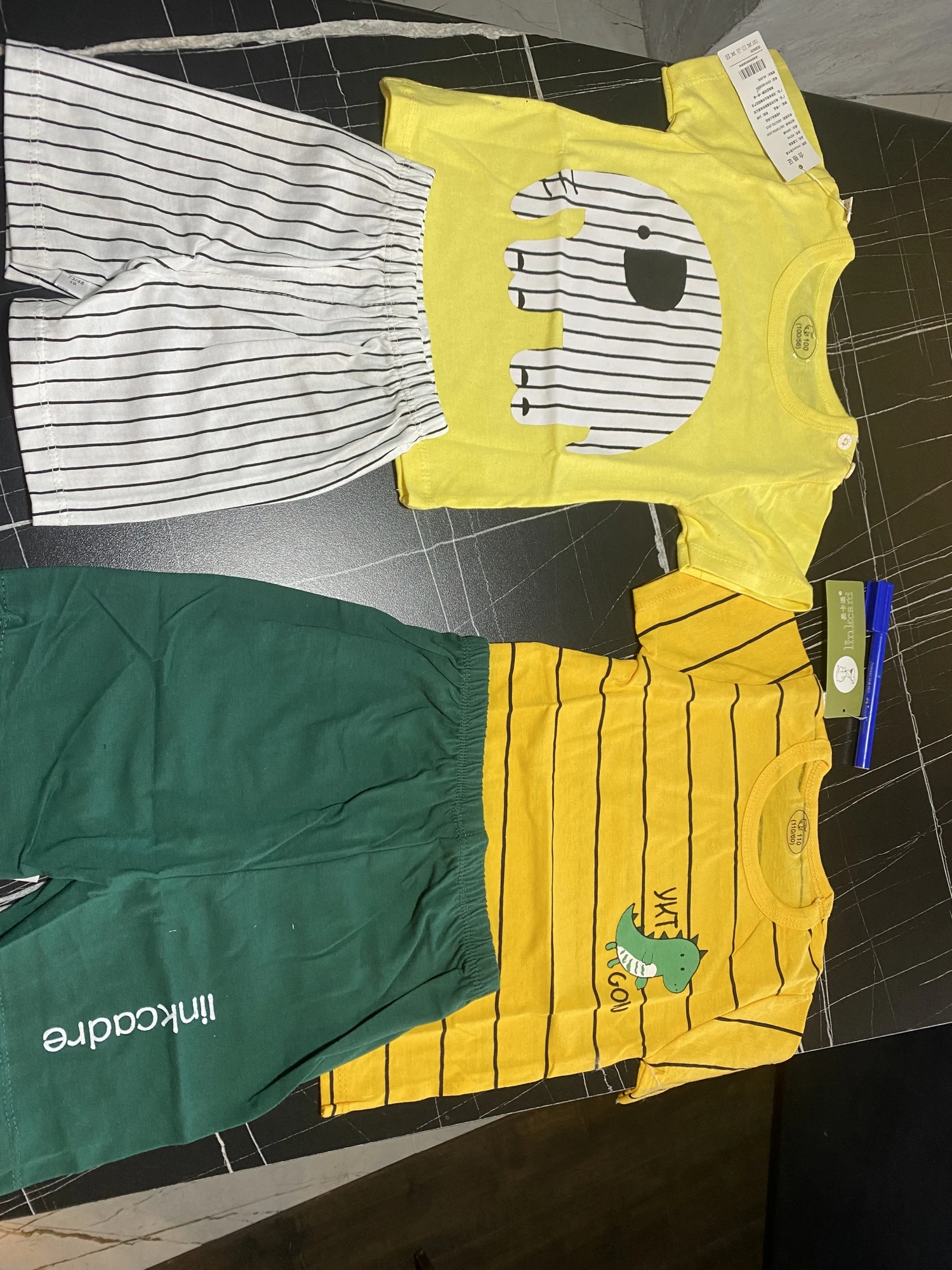 Комплект один вышел 270 рублей. Рисунок на футболке после нескольких стирок становится блекло серым с катышками. Совершенно не поняла для чего ярлык на плече сделали, который не срезать. Брала на 66 см размер 80- самое то, но шорты меньше футболки. Качество=стоимости.