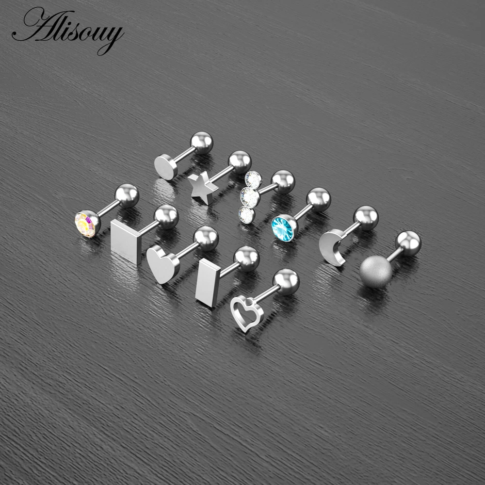 Alisouy 2 шт. Для женщин мужчин сердце Треугольники в форме квадрата в форме звезды луна циркон для пирсинга из нержавеющей стали, можно носить в ушах, серьги-гвоздики из спирали ушной хрящ