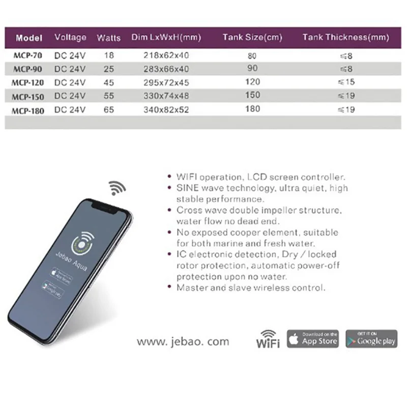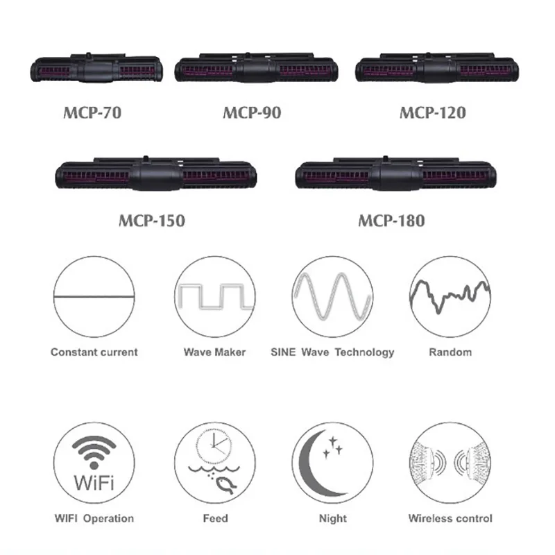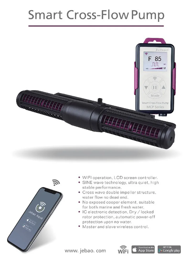 Примечание:SCP-70/90/120/150/180 (без функции WiFi)MCP-70/90/120/150/180 (с поддержкой Wi-Fi Функция)Характеристика:1:Насос может управляться вручную контроллером Jebao (только серия SCP),Можно управлять с помощью приложения Jebao через WiFi или ручное управление с ЖК-дисплеем (только серия MCP).2: технология синусоидальной волны, очень высокая стабильная производительность3: двойная структура крыльчатки поперечной волны, поток воды не тускнеет.4: без постороннего Купера, подходит как для морской, так и для пресной воды5: IC электронное обнаружение, защита от сухого/заблокированного ротора, автоматическая защита от отключения питания без воды