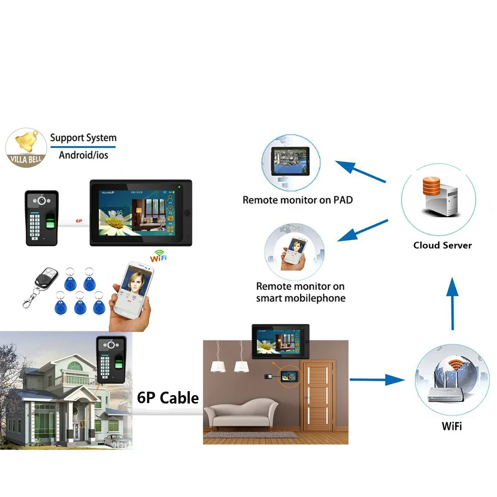 Домофон проводнойбеспроводной, 7 дюймов, Wifi, сканер отпечатка пальца, RFID, пароль, видео, домофон, домофон, 1000TVL, проводная камера, приложение для разблокировки, запись