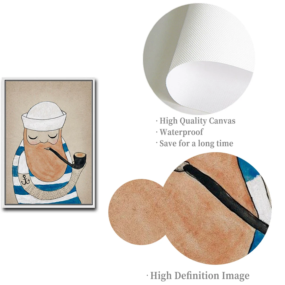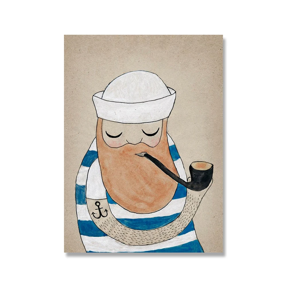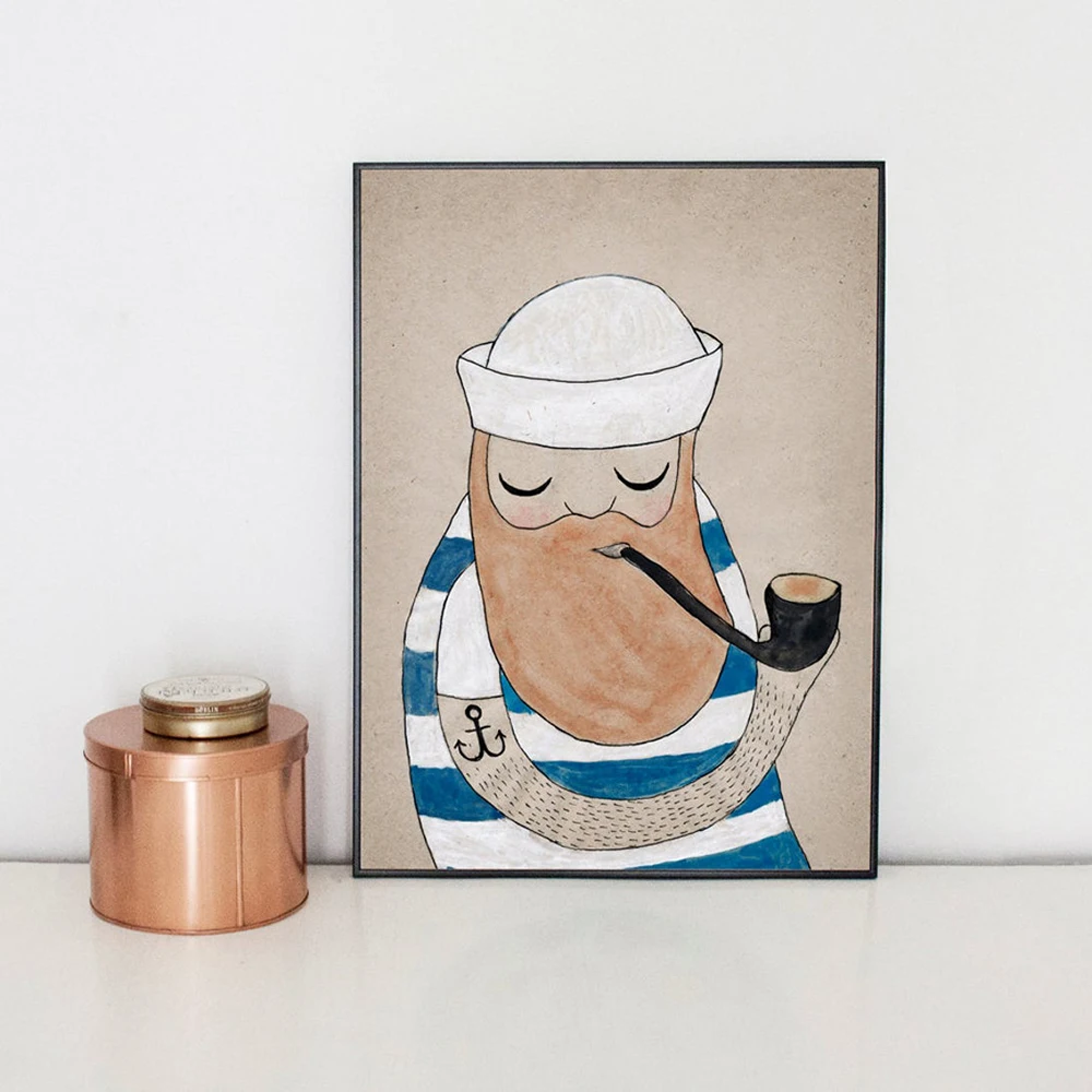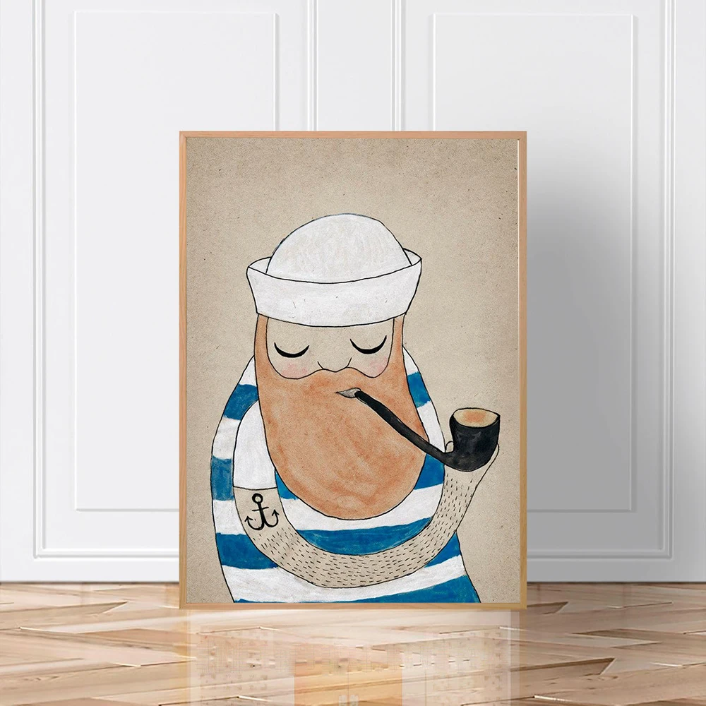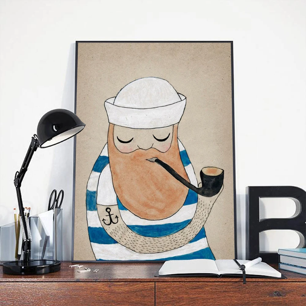 Забавный плакат с моряком и длинной бородой, милый человек, кусает трубку, искусство, ручная роспись, холст, живопись, спальня, детская комната, настенные украшения, картины