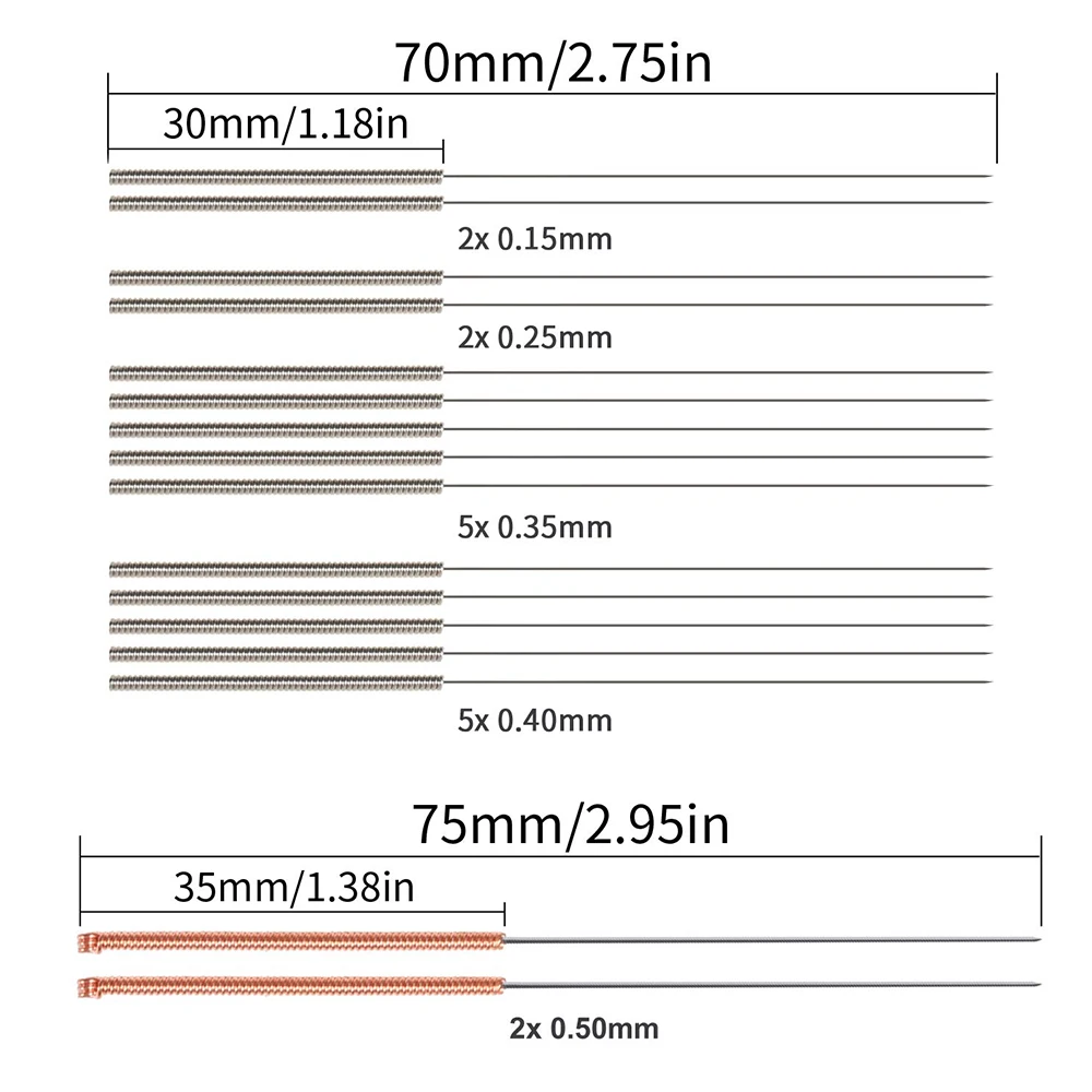 Материал: нержавеющая сталь0,15 мм/0,25 мм/0,35 мм/0,40 мм иглы:Длина хвостовика: 3 см/1,18 дюймаОбщая длина иглы: 7 см/2,75 дюймаДиаметр иглы: 0,15 мм/0,25 мм/0,35 мм/0,40 мм0,50 мм Игла:Длина ствола: 3,5 см/1.38inИгла Общая длина: 7,5 см/2.95inДиаметр иглы: 0,5 мм