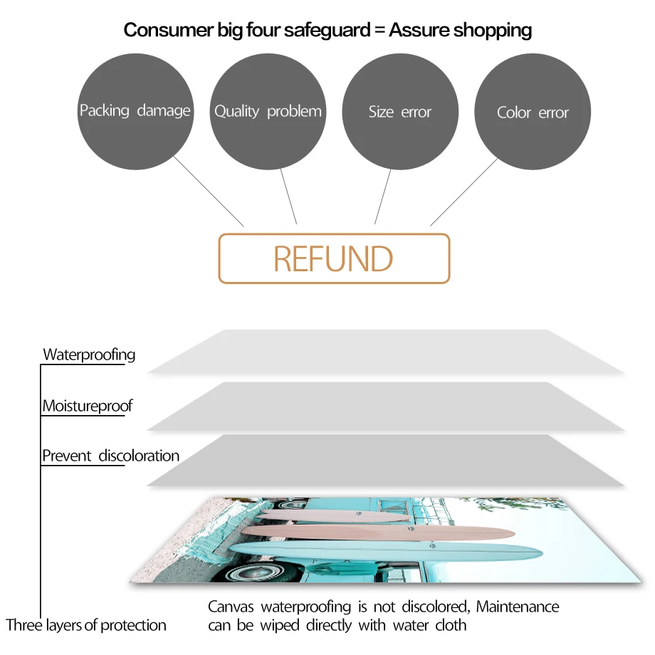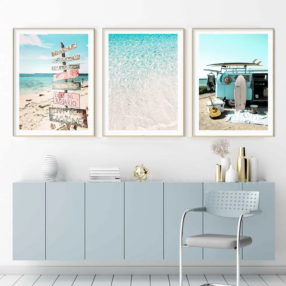 Море, пляж, автобус, доска для серфинга, пальмы, летние настенные художественные картины на холсте, скандинавские плакаты и принты, настенные картины для декора гостинойМатериал: экологически чистый хлопокХарактеристика: солнцезащитный, водонепроницаемый, никогда не выцветает