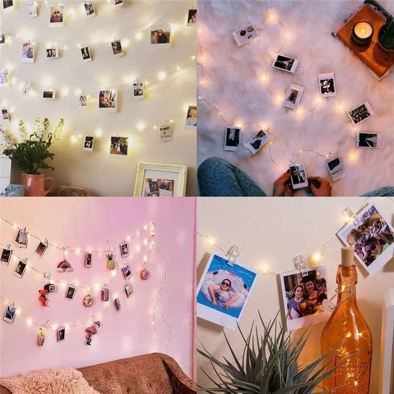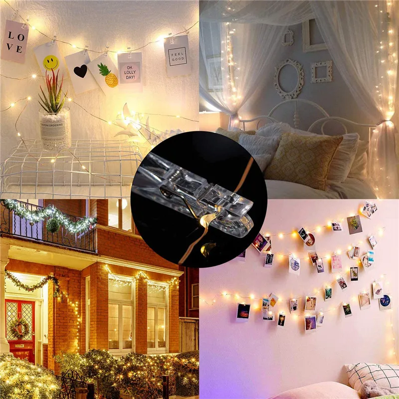 Тип 1 : 10 шт. прозрачный зажим для фото и 2 м серебряный провод с 20 RGB/теплыми белыми лампами (питание от аккумулятора/USB)Тип 2 : 30 шт прозрачный зажим для фото и 5 м медный провод с 50 теплыми белыми лампами (питание от аккумулятора/USB)Тип 3 : 50 шт прозрачный зажим для фото и 10 м медный провод с 100 теплыми белыми лампами (аккумулятор/USB светодиодный светильник феи)