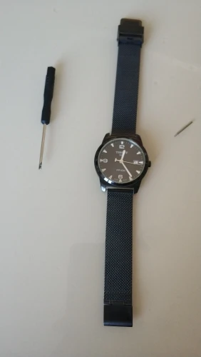 Как и на фото, он выглядит очень хорошо и поставляется с небольшим инструментом для смены ремешка. Настоятельно рекомендуется продукт.