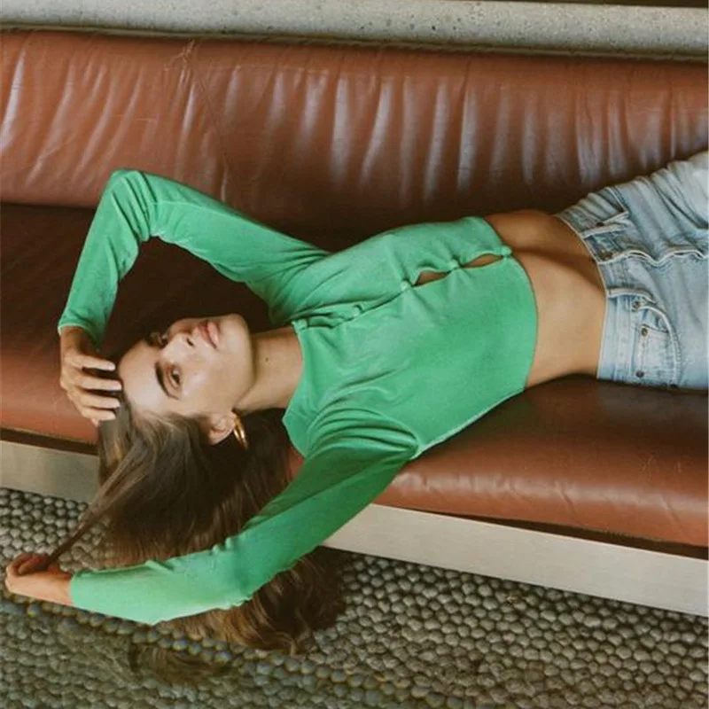 Зеленые Короткие топы, летняя Клубная одежда на пуговицах, женские футболки, повседневные пикантные облегающие рубашки с длинным рукавом для вечерние