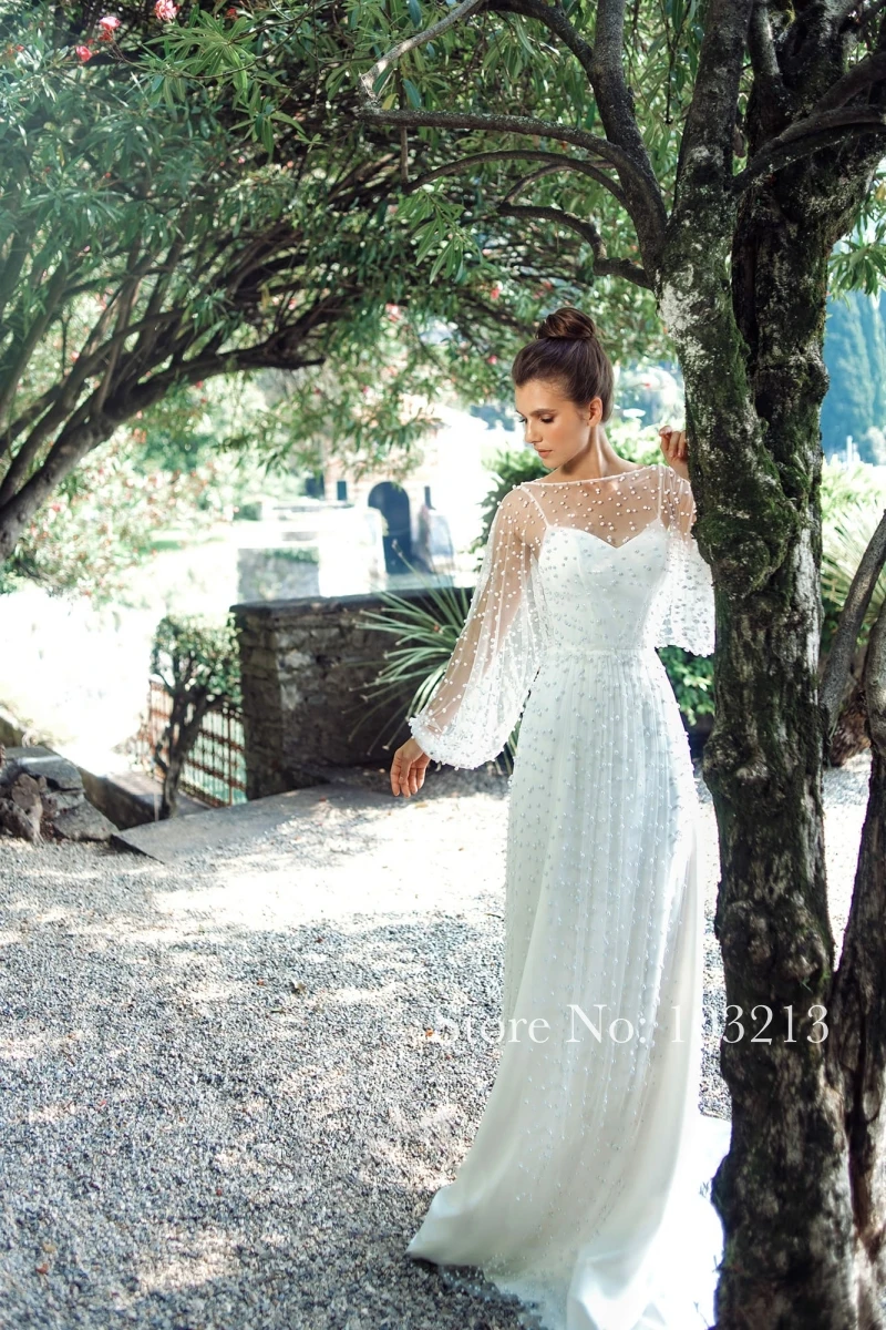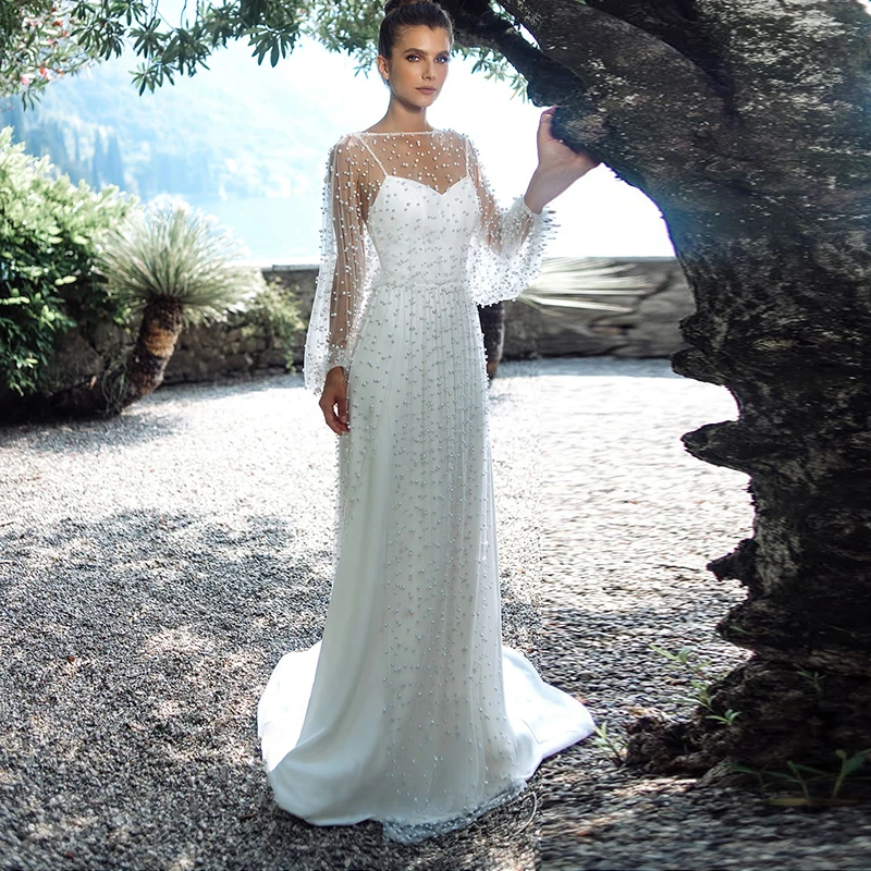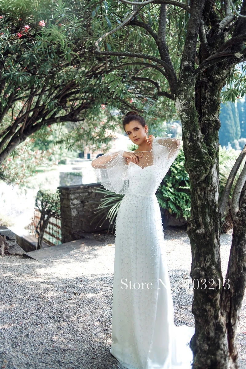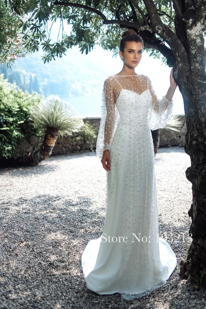 Последняя новинка; Роскошные в продаже с длинным рукавом жемчугом Свадебные платья Иллюзия круглый вырез шифоновая Свадебные Вечерние вечернее платье 2021