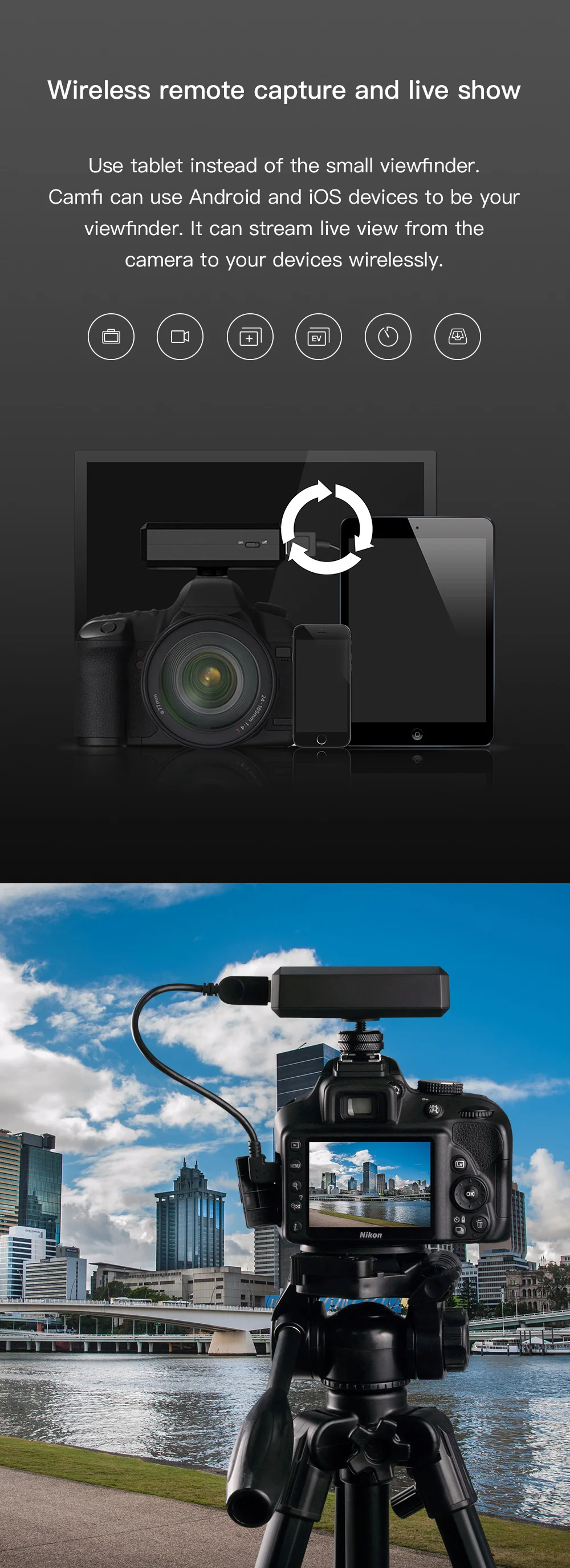 Поддержка Sony -- продукты CamFi поддерживают камеру Sony / Canon / Nikon, включая установку фокусировки и HDR на камере.
