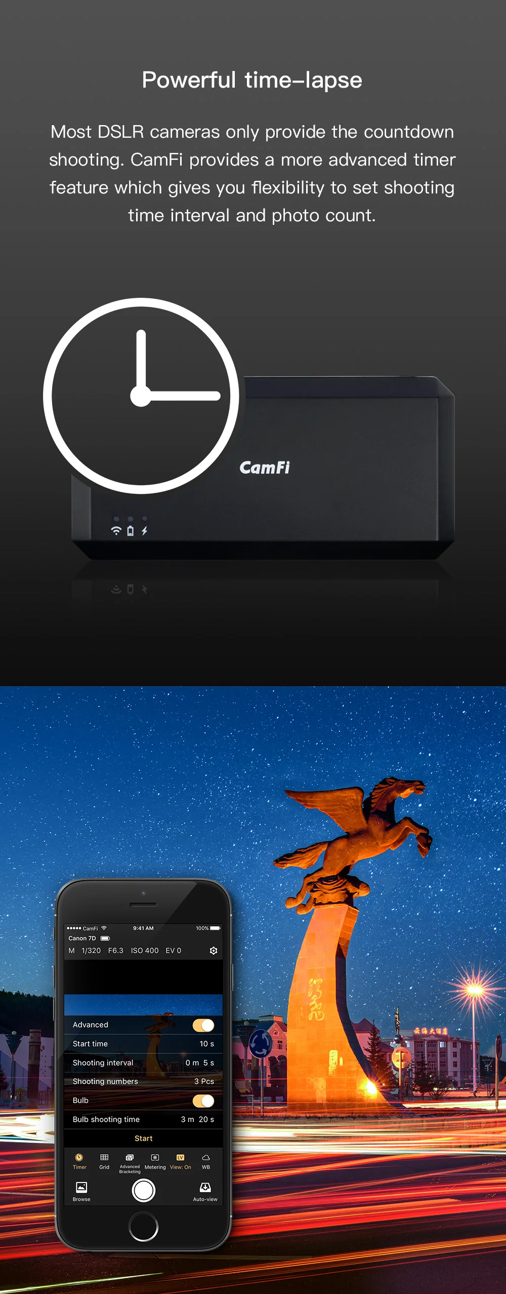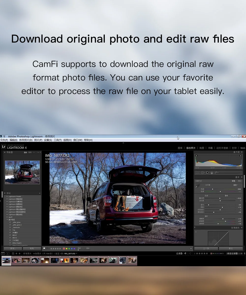 Поддержка Sony -- продукты CamFi поддерживают камеру Sony / Canon / Nikon, включая установку фокусировки и HDR на камере.
