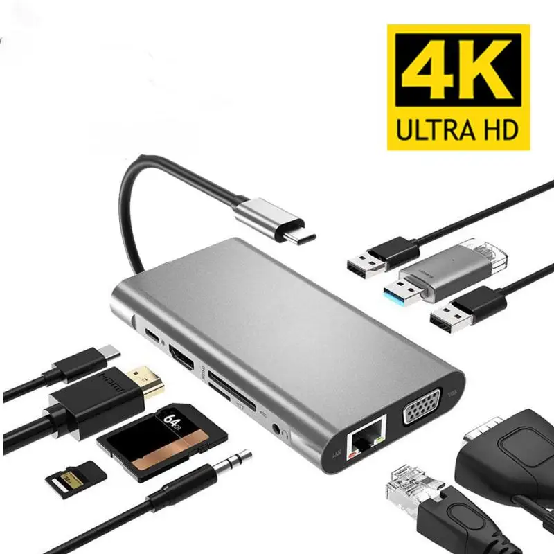 Разветвитель USb Type-C 10 в 1 для MacBook, совместимый с 4K, VGA, RJ45, PD, USB 3,0, разъем 3,5 мм, устройство для чтения SD, TF карт, док-станция, зарядное устройство 2021