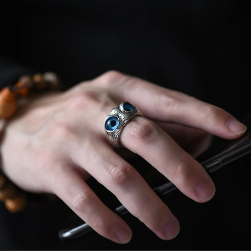 Кольцо унисекс, винтажное регулируемое с голубым глазом в виде совы...