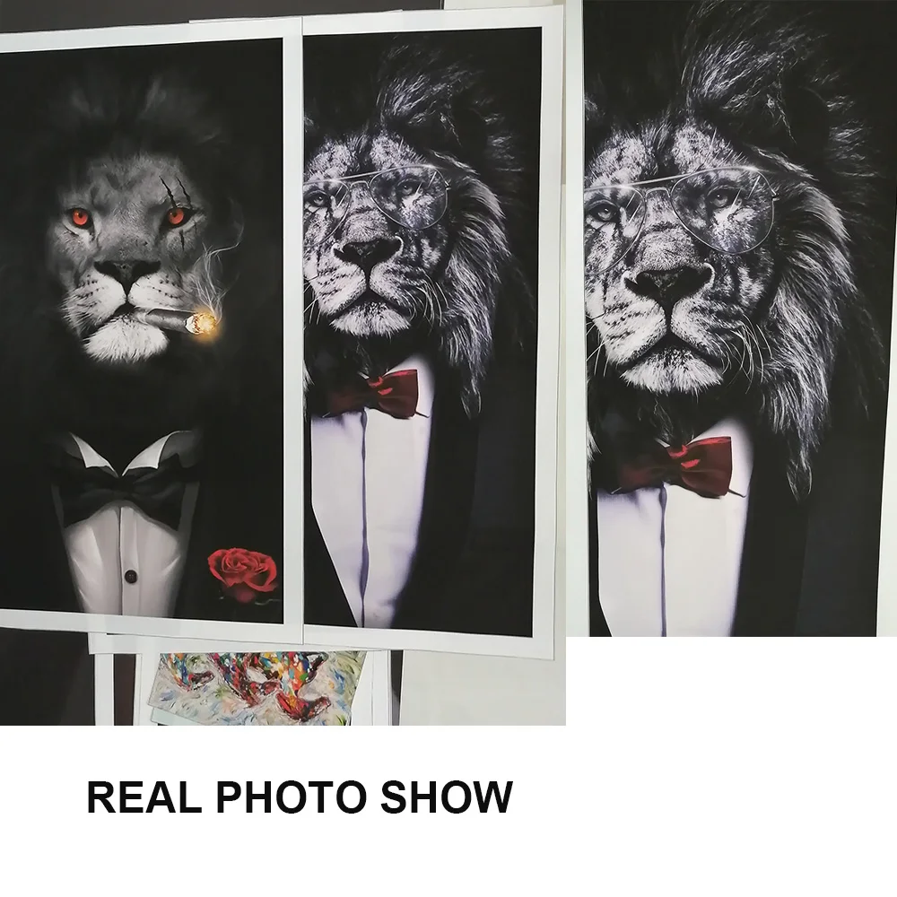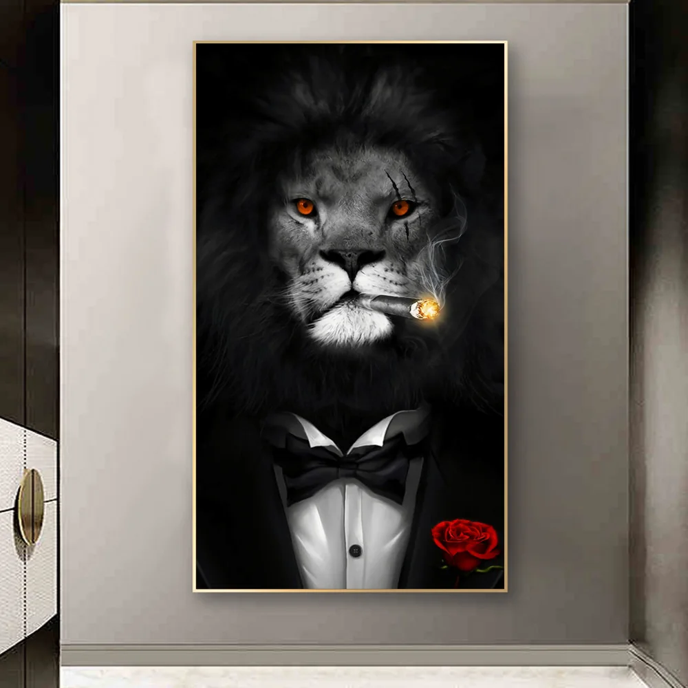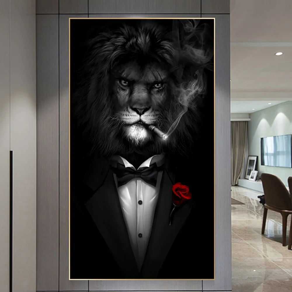Картина на холсте с изображением черного дикого льва в костюме, курительная сигара, искусство на стену, картина для комнаты, домашний декор, квадраты