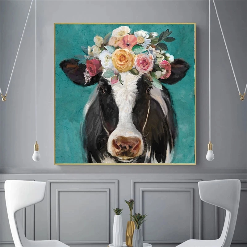 Животное Искусство из коровьей кожи с цветами на его голова плакаты и принты картины на холсте искусство стены фотографии для Декор в гостиную (без рамки)