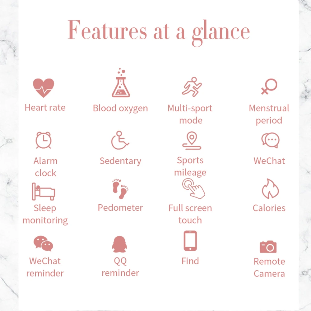 1,08 дюймовый сенсорный экран высокого разрешения IPS, разрешение 220*128Динамический Тест сердечного ритма, Женский цикл ухода за теломВремя, отображение часов, секундомер, кровяное давление, уровень кислорода в кровиВремя, отображение часов, секундомер, кровяное давление, уровень кислорода в кровиМониторинг сна (время сна, качество сна)Напоминания о звонках, SMS напоминание, qq напоминание, Wechat напоминание, Wechat itter.viber.lineНайти мобильный телефон, напоминание о сидячем положении, напоминание о лекарствах, напоминание о питьевой воде, напоминание о будильнике, напоминание о памяткеСпортивный режим: бег, альпинизм, прогулки, езда на велосипеде, футбол, баскетбол, настольный теннис, бадминтонКамера дистанционного управления (встряхните, чтобы сделать фотографии), управление музыкойСинхронизация приложений Android и Apple: F FITЯзык пользовательского интерфейса: китайский, английский, японский, французский, немецкий, Италия, Испания, Россия, Португалия, малайский, польский.