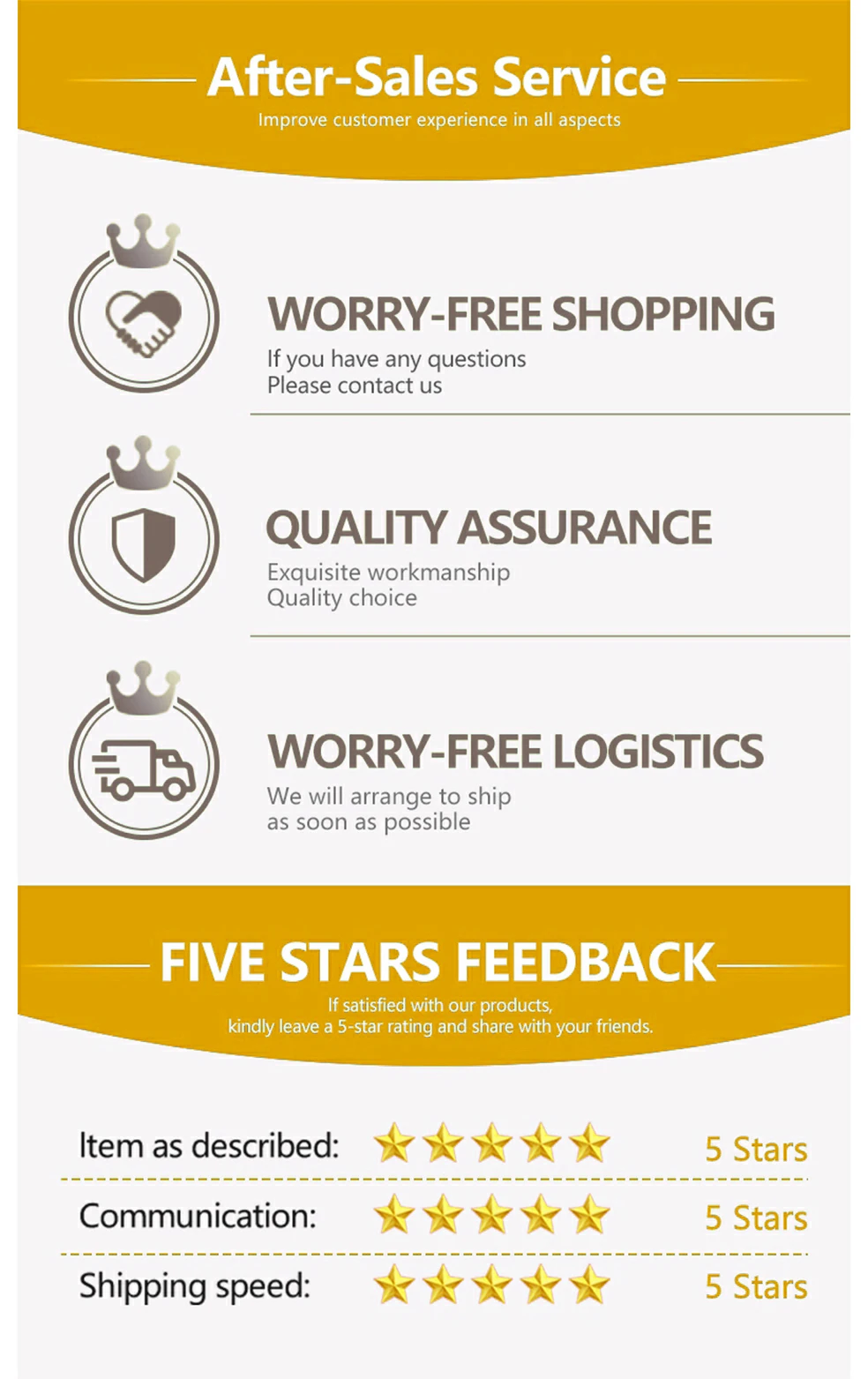 1. Мы будем очень признательны за раннее подтверждение покупателем после получения товаров.2. Поскольку ваши отзывы очень важны для развития нашего бизнеса, мы искренне просим вас оставить положительотзывы в о нас, если вы удовлетворены нашими продуктами и услугами. Это займет всего 1 минуту, но эта минута имеет для нас чрезвычайно важное значение.3. Пожалуйста, свяжитесь с нами, прежде чем оставлять отрицательный или нейтральный отзыв. Мы поможем вам решить любые проблемы.